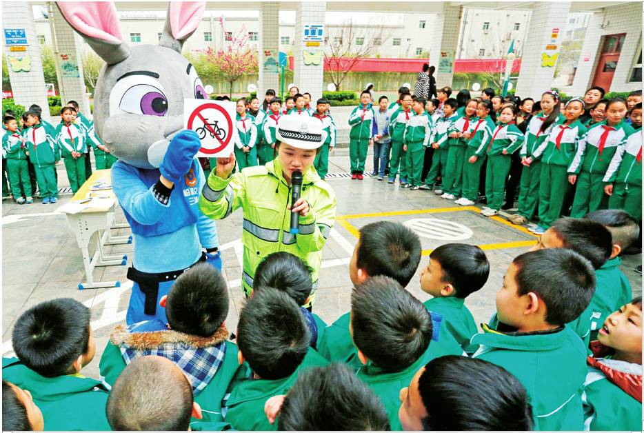 民警李菲携卡通人物“朱迪警官”正在为同学们讲解交通安全知识。
