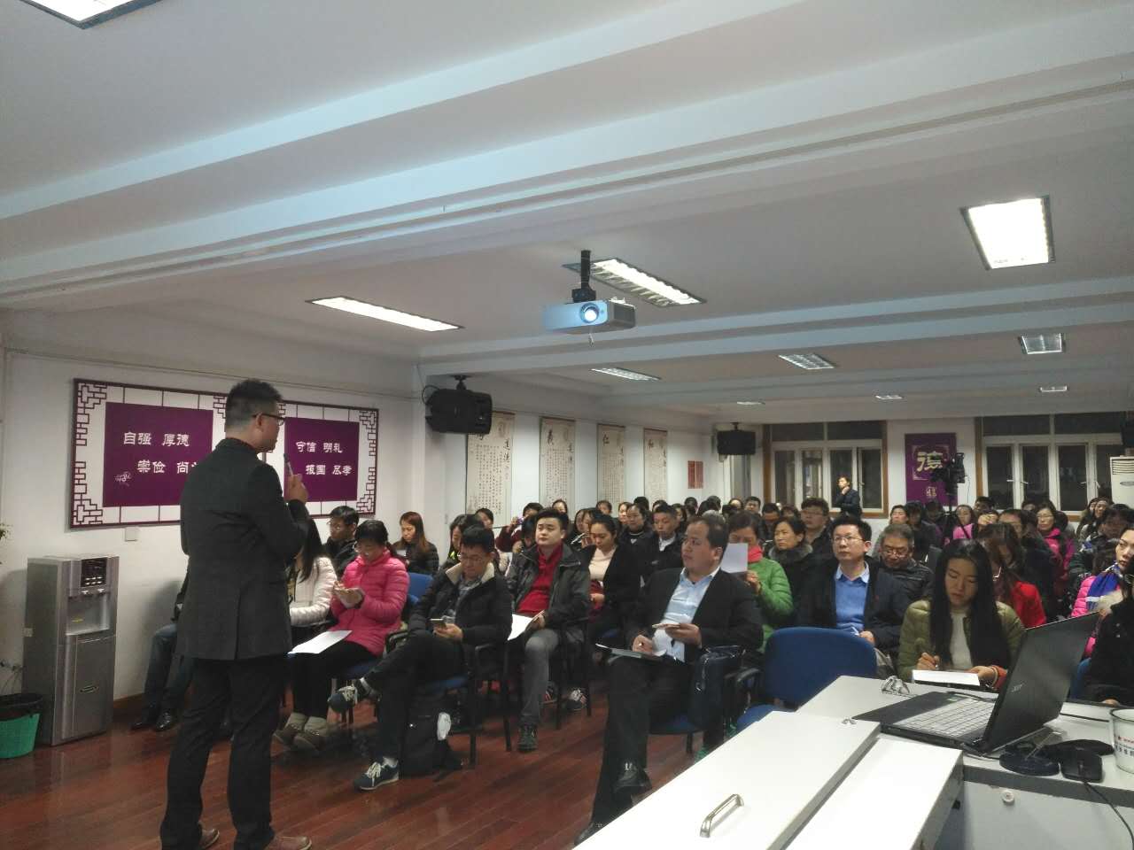 此次讲座,齐老师用轻松幽默的话语营造了一个愉悦的氛围, 家长们全神贯注,用笔和相机用心记录着,用笑声和掌声热情回应齐老师的提问。齐老师单刀直入,先给家长们几个值得思考的问题和关键字,简洁明了地反映了当前孩子们共同的心声。继而又剖析了家长在教育孩子过程中的疑惑和需要反思的两面,即自己的孩子和别人家孩子存在的差异。紧接着对症下药,介绍了心理学上关于人与人在气质上的差异以及9个维度,结合自己和女儿之间的亲身案例,和多年在教育领域收集的案例,给出切实可行的建议,即透过气质的眼睛,看到和理解孩子和自己在气质上的分歧点和契合点,根据孩子的气质,调整自己的期望,回应和规则、协调亲子的相处模式等,引起了现场家长们的反思和共鸣。