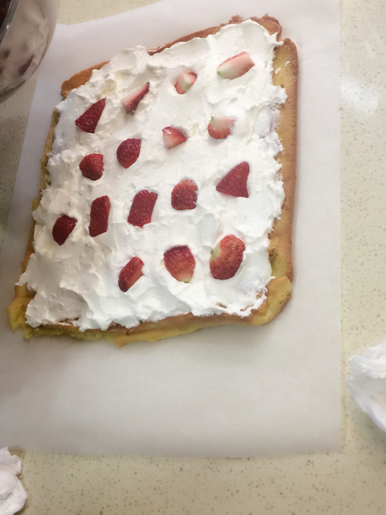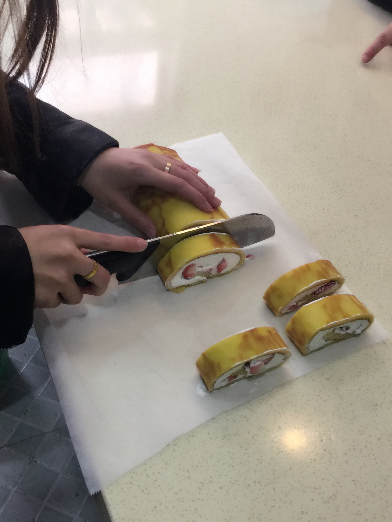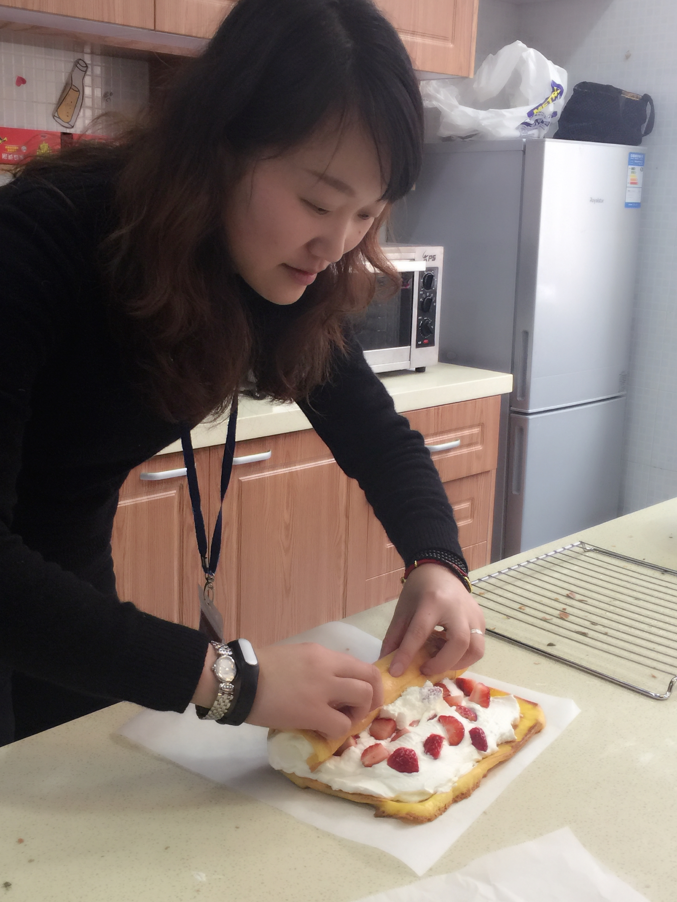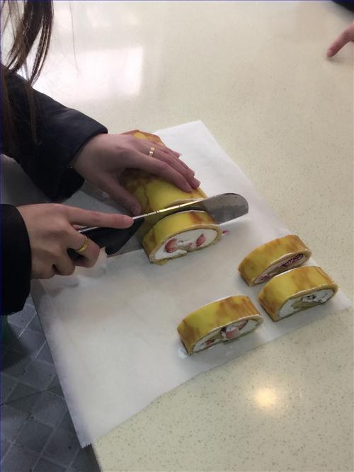 这边吃完,那边蛋糕片也在王维洁老师的指导下制作完工,马上出炉了。从起初的打蛋到烘烤,再给它涂上一层奶油,放点草莓,最后圈起来,切成一片一片入口清香,奶味十足的瑞士卷,老师们经历了互相帮助、合作的过程。教室中飘荡着教工们的欢声笑语。