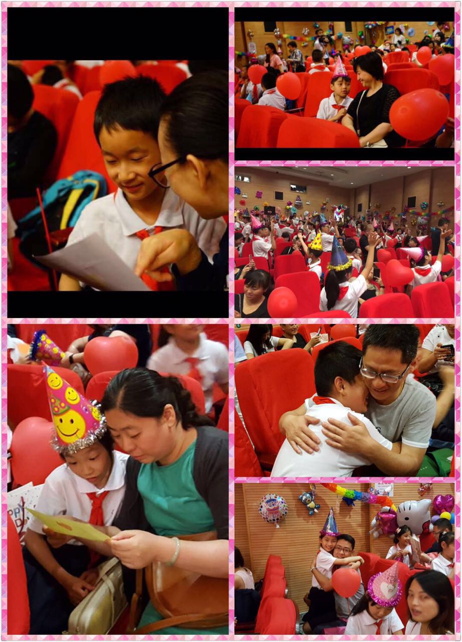 正当大家在回忆三年的小学生活时,生日蜡烛已经点燃,精美的生日蛋糕由三(2)班沈思绮同学的妈妈和王天乐同学的爸爸妆扮的米奇和粉红猪推上了舞台,全场唱起《生日快乐》歌,孩子们精心准备的感恩卡也在此时捧到了爸爸妈妈的跟前,此时的一个热烈的拥抱胜过了千言万语,全场沉浸在无限幸福的气氛之中。更为激动的是:佘瑛副校长和学生处的倪蕾老师还表彰了在成长体验课程中表现出色的优秀学员。学生们在体验中成长,父母也欣喜地看到孩子们的进步与变化。