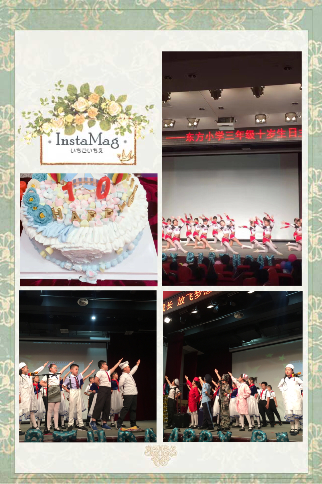 终于,69日生日庆典活动如约而至了。当大家步入装扮一新的会场时,感觉立刻进入了一个魔幻般的童话王国,气球和彩带将整个会场装饰得色彩斑斓,而卡通的米奇和粉红猪(这届孩子的属相是猪或老鼠)活泼有趣,与孩子们挥手、拥抱……伴着孩子们的欢笑声,校舞蹈队的孩子们踏着欢快的旋律出场了,孩子们专业的舞姿、良好的舞台表现吸引了所有人的目光,把会场的气氛也带动起来了。