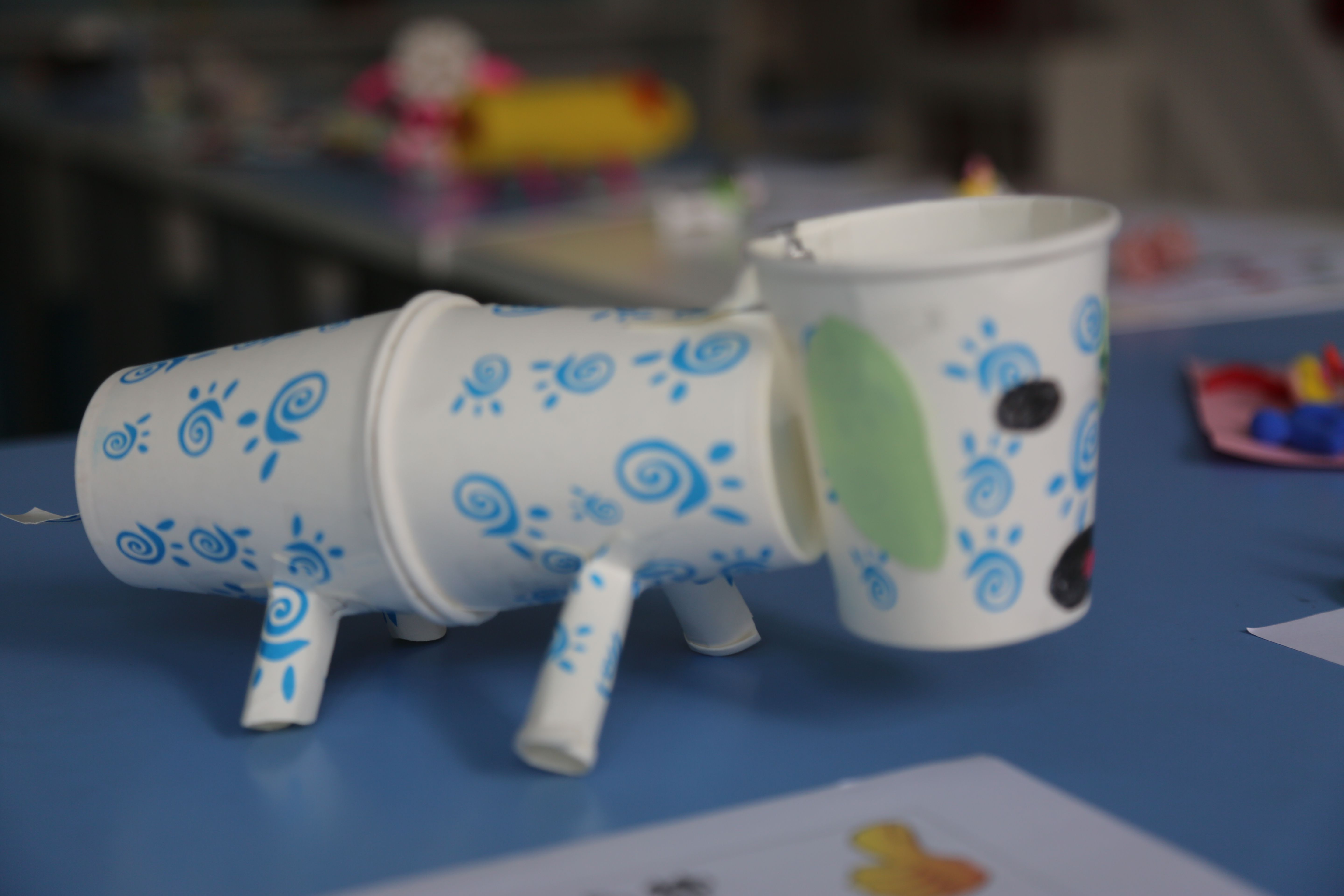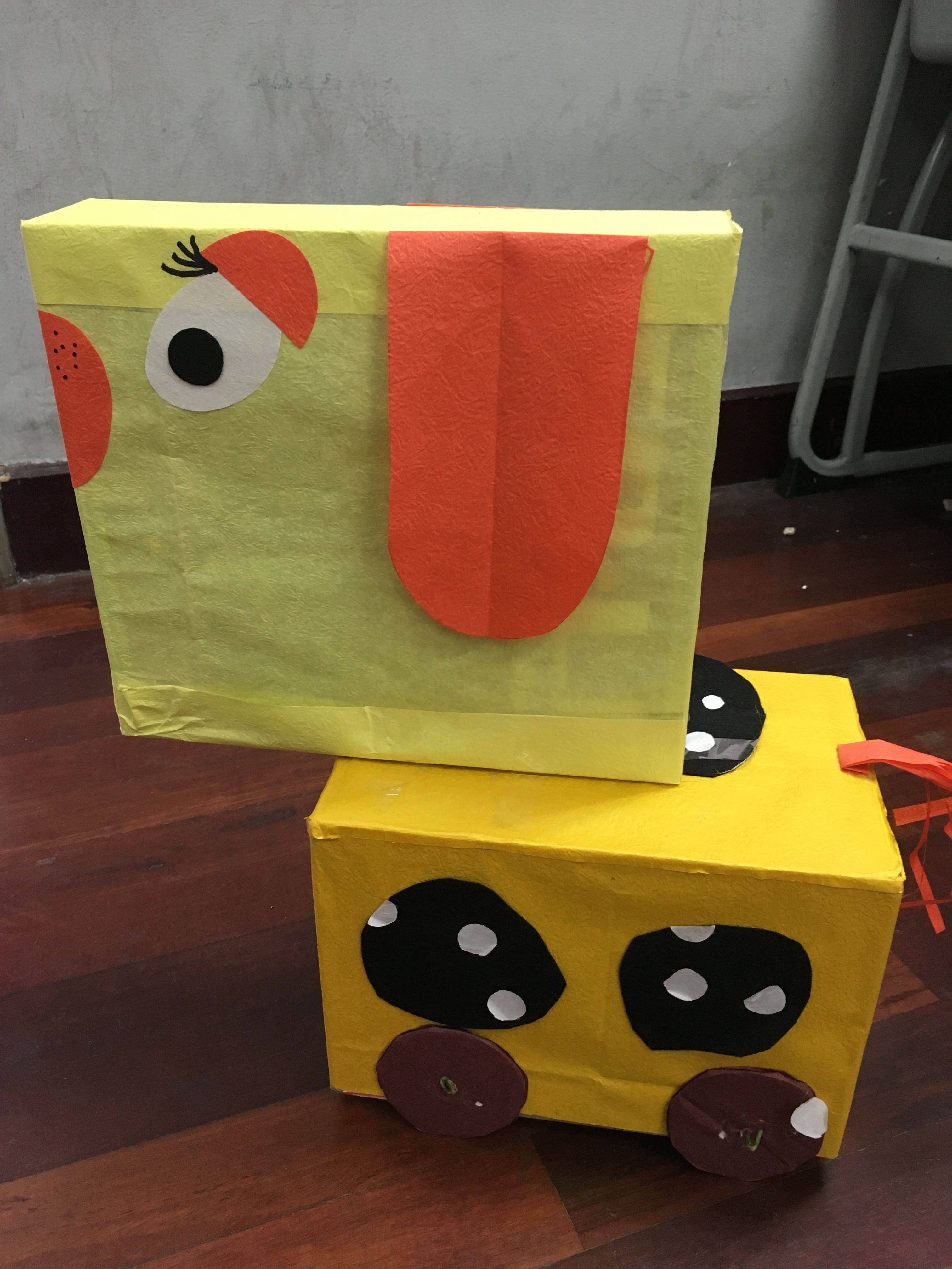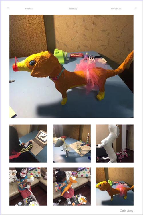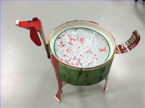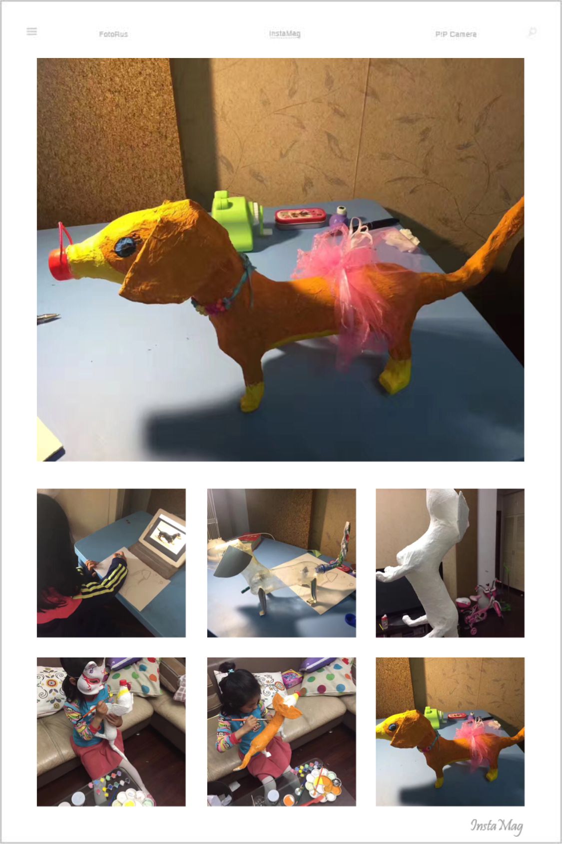 蓝村校区一(1)中队的陈祺小朋友,在爸爸妈妈的帮助下,利用饮料瓶和纸糊彩绘的方法,做了一只漂亮的腊肠狗。爸爸妈妈还用相机记录了制作的全过程。