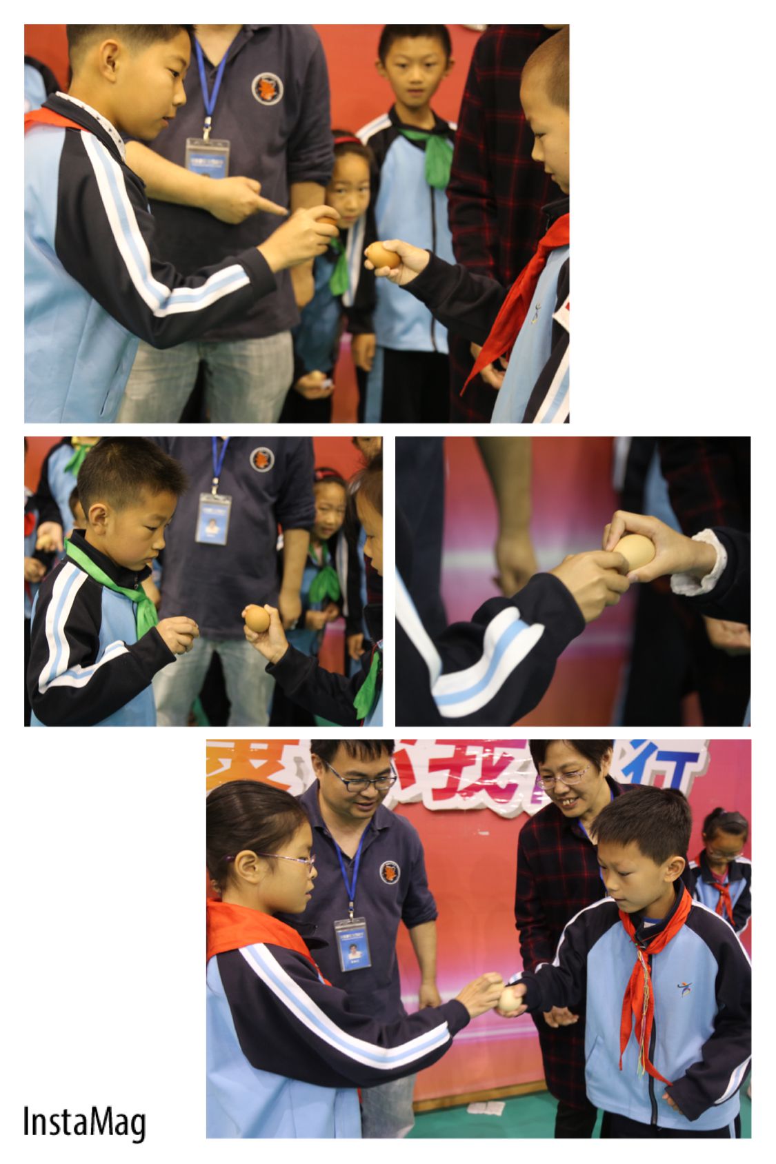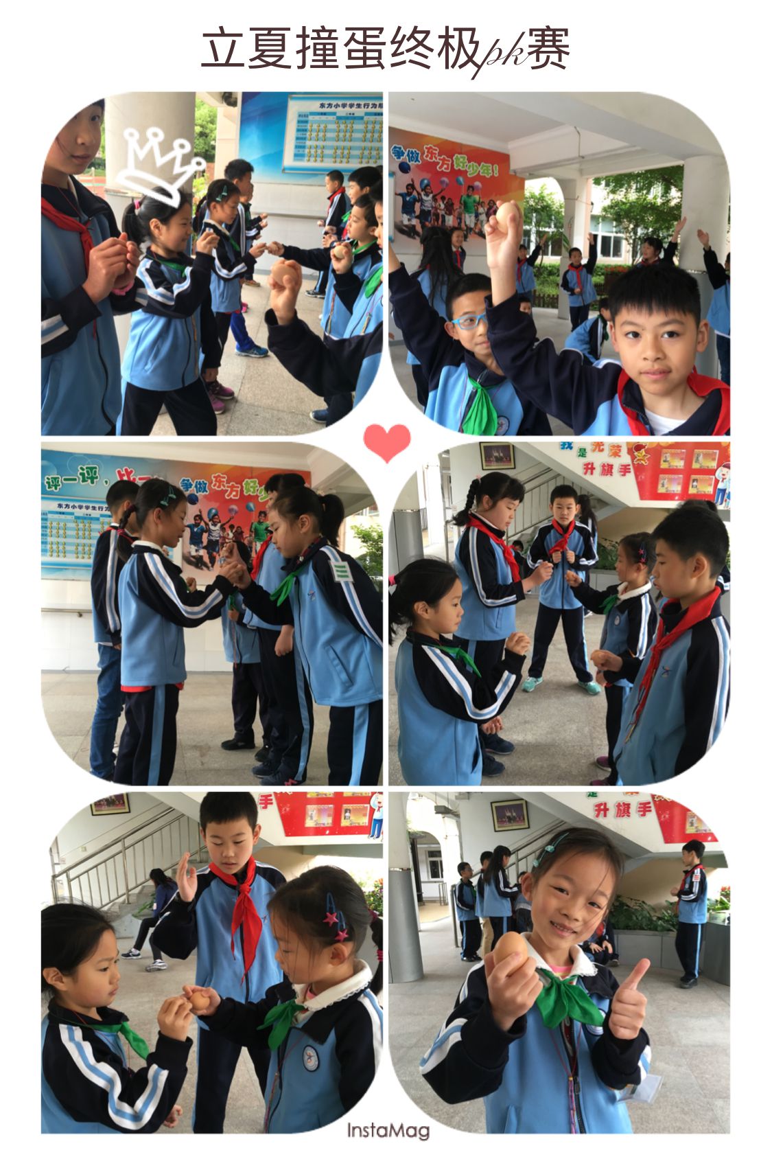 立夏当天的撞蛋比赛精彩激烈,每个中队获胜的2名队员在周一的升旗仪式上展开了角逐,争夺撞蛋达人和撞蛋大王的称号。能够在校级终极PK赛中击败对手,孩子们特别兴奋,举着自己的鸡蛋好似举着奖杯,为自己的鸡蛋骄傲,也为自己努力而喝彩!