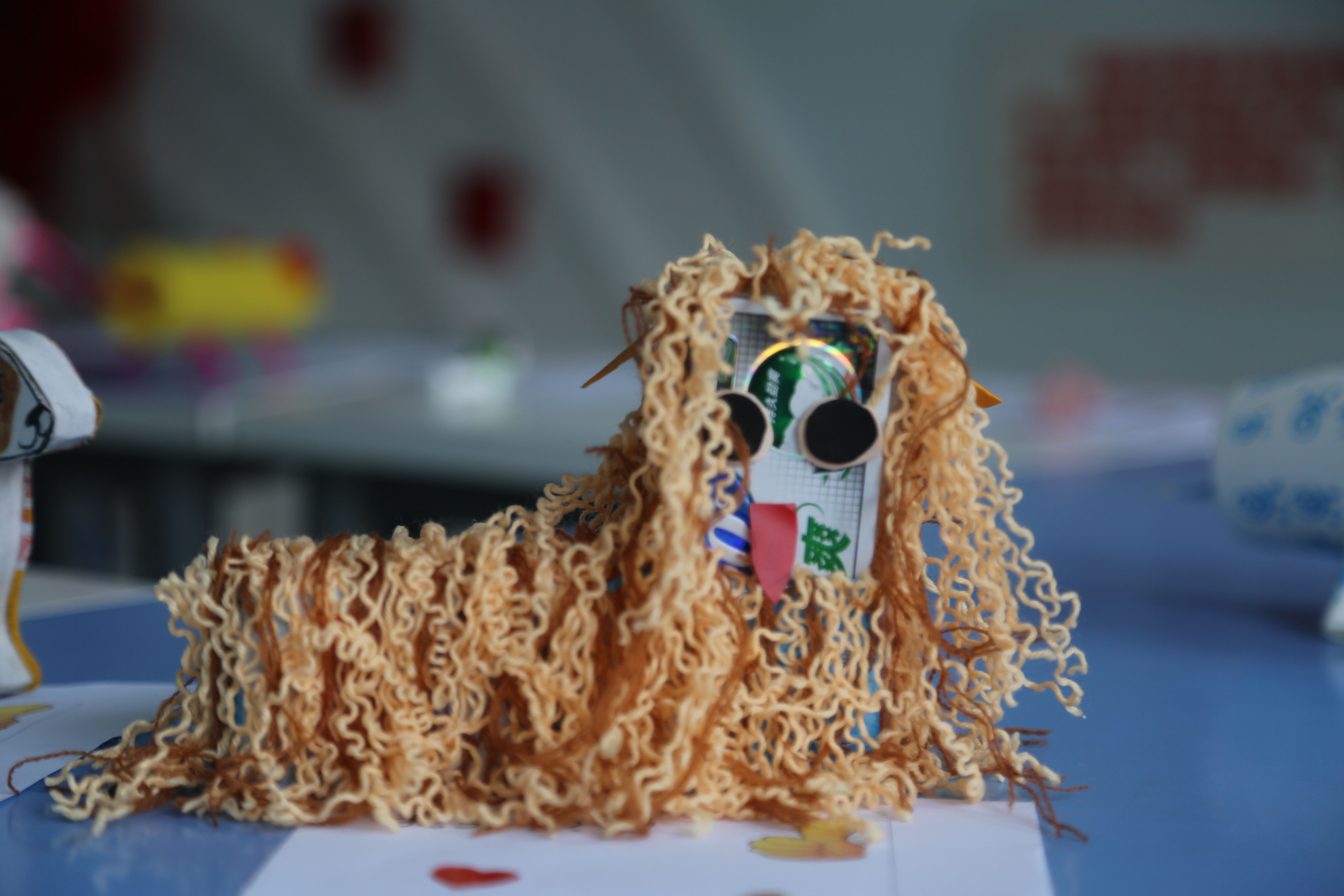 有的是用废旧材料制作而成:用旧绒线做成的卷毛狗;用方面盒剪剪、折折而成的立体狗;有用纸盒包装、粘合而成的变形狗;有一次性杯子拼搭的卡通狗……