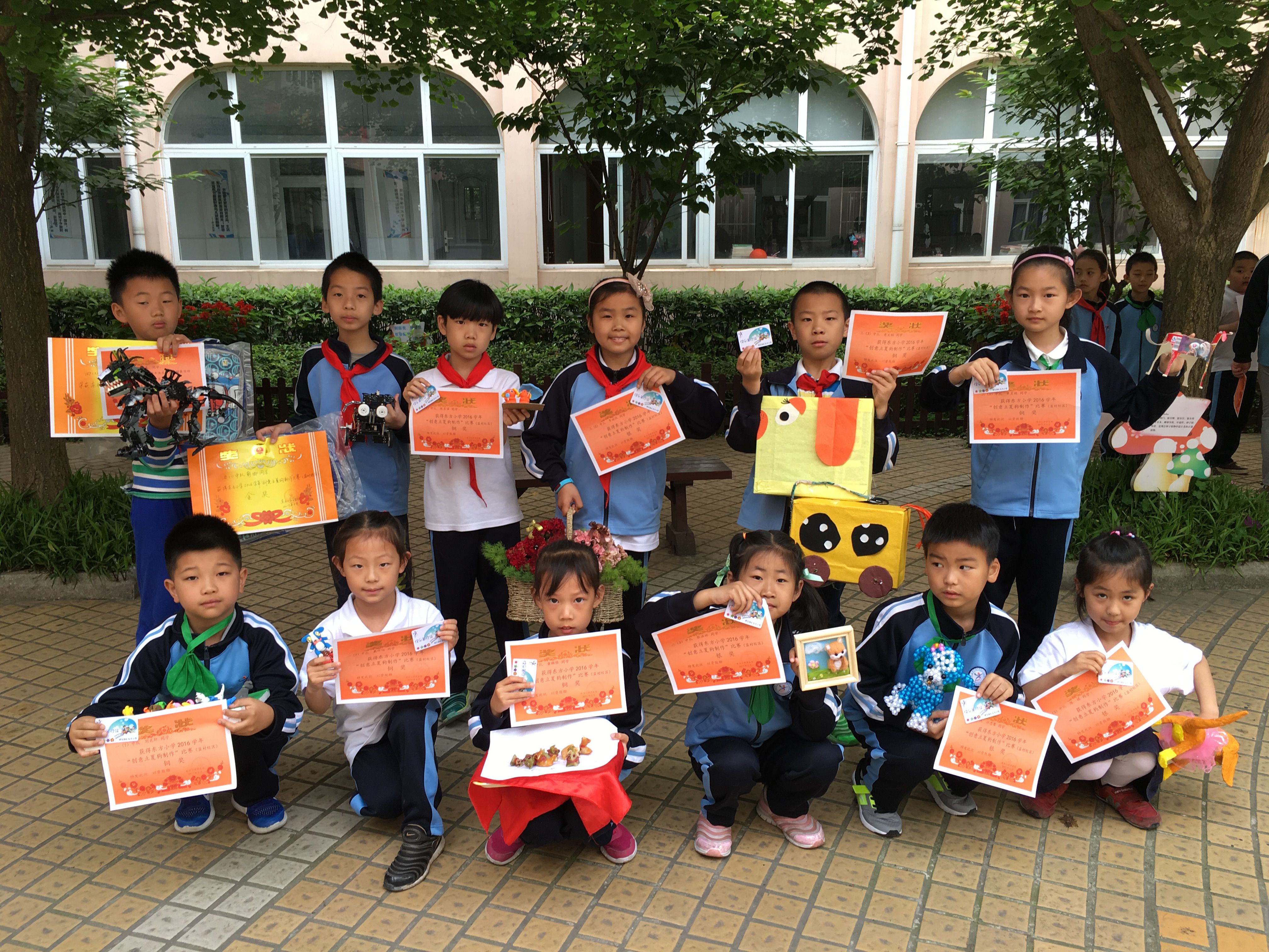 经过统计,两个校区各产生了金、银、铜奖12名。在14周的升旗仪式上,获奖小朋友拿着心爱的创意立夏狗走上领奖台,向全体老师和同学介绍自己的创意。蓝村校区获得金奖的是两名心灵手巧的男生,他们的作品有着相同之处,——都是自己拼装的,小狗都能动。五(1)中队彭卿同学的电子遥控立夏狗更是赢得了全场的掌声。获奖的小朋友还从校长手中接过了奖状和快乐通行证。