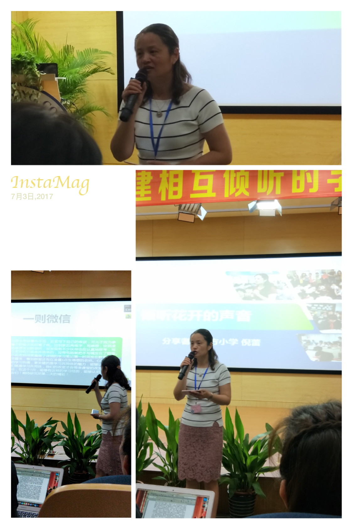 在学习共同体里倡导的是平等、协同,因此,也有不少普通的教师走上了讲台,分享自己和学习共同体的故事。倪蕾老师就获得一次珍贵的分享的机会,讲述了自己班中小嘉翎在学习共同体课堂里的变化的故事;中午休息得时间,倾听了四位学习共同体实践者的分享,三位校长,一位教师。整整2个小时,始终在认真地倾听,没有感觉到时间的存在。绍兴的周校长身先士卒翻转课堂;山西的张副校长自费参加所有培训,在校长不支持的情况下带领着走着同样追求的2位老师实践着,其中心酸,辛苦让她潸然泪下,但她仍然坚持着;山东的程老师,来自农村的一所高中,要带3个班(每班60人)的高中语文,带一个班的班主任,还要做学校宣传科的工作,每天6节课。如此大的工作量,但是对于教育有追求,又梦想,有行动。他也是1个人在实践着学习共同体。也正为是一个人,让他想出了很多的办法,也付出了很多。他从一开始的“盲”,盲目地去做,只为抓分,到后来的“忙”,整天忙忙碌碌却碌碌无为,再到“茫”,剑拔弩张求心生茫然,找不到自己想要的教育和生活,到最后的“芒”,在学习共同体里看到了生命地光芒。这心路历程真实而又让人感动,更是钦佩!一个有梦想和追求的人,就会自觉地努力,前行,会成就他的学生,也成就了他自己。不是名,不是利,而是获得了内心真正的幸福!还有一位也是来自农村小学的校长,带着浓重的外地口音,听起来走着吃力,但是幽默,的表达了还是吸引了我们,看到了他对农村教育,对农村孩子发自内心的爱!能够在学习共同体的时间路上遇到这样一群同行者,内心真是幸福满满!