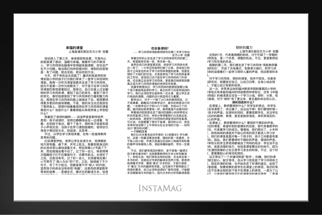 两天的理论学习、读书分享,让大家对于学习共同体有了种冲动——就是想看看学习共同体的课堂到底是怎样的。于是,后两天的学习满足大家的好奇。集体备课——学员上课——其他学员观察——课后探讨——继续磨课——再一次上课——再一次课堂观察——再一次课后研讨。通过两轮的教学实践,学习共同体变得更清晰了,作为一线教师的我们也有了实践的一些基本策略。我们小学语文组以日本的绘本《小蛇散步》为教材,进行了课堂实践,所有观课老师则是认真观察孩子们的学习表现,让老师们惊讶、震惊,原来孩子的学习是这样的。大家都不由自主地开始反思自己的课堂教学,开始思考学习共同体课堂和传统课堂的差异,开始寻找自己开始学习共同体实践的起点……整个磨课实践的过程中,F4的林校长始终陪伴在我们身边,给予了我们太多太多的指导和帮助。林校从现场搜集了太多的学生表现的证据来印证学习共同体的相关理念,让我们信服口服。