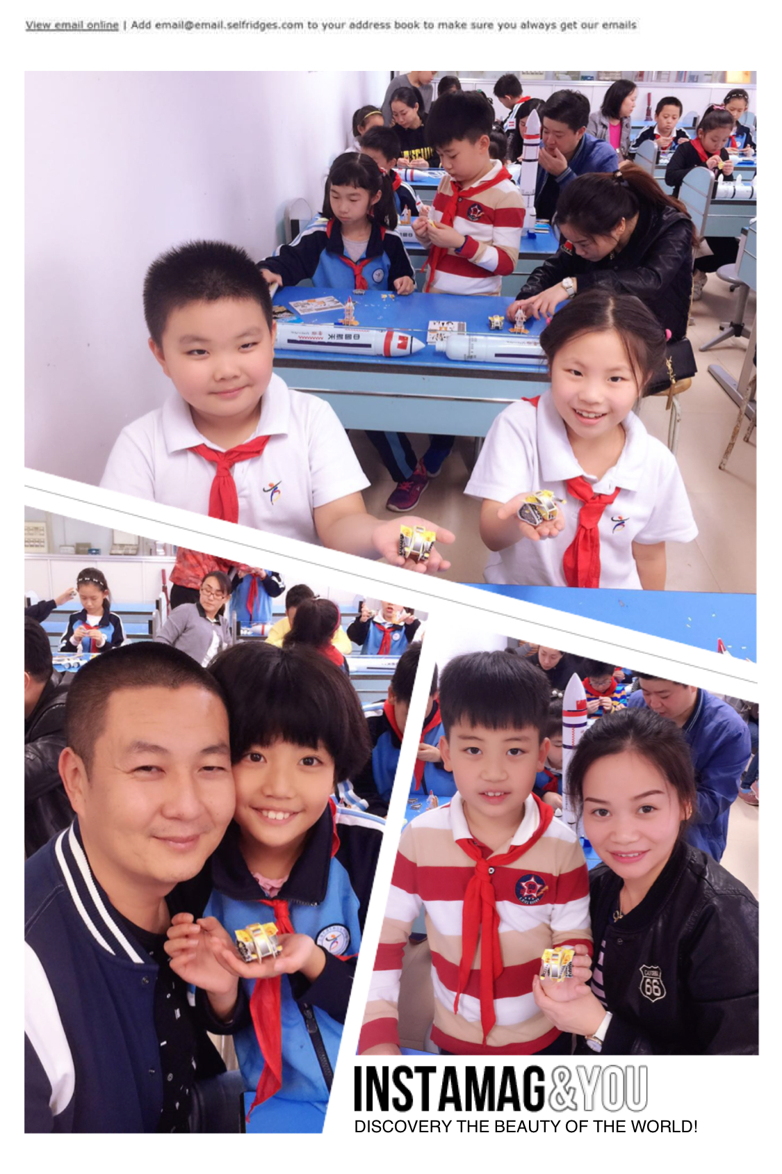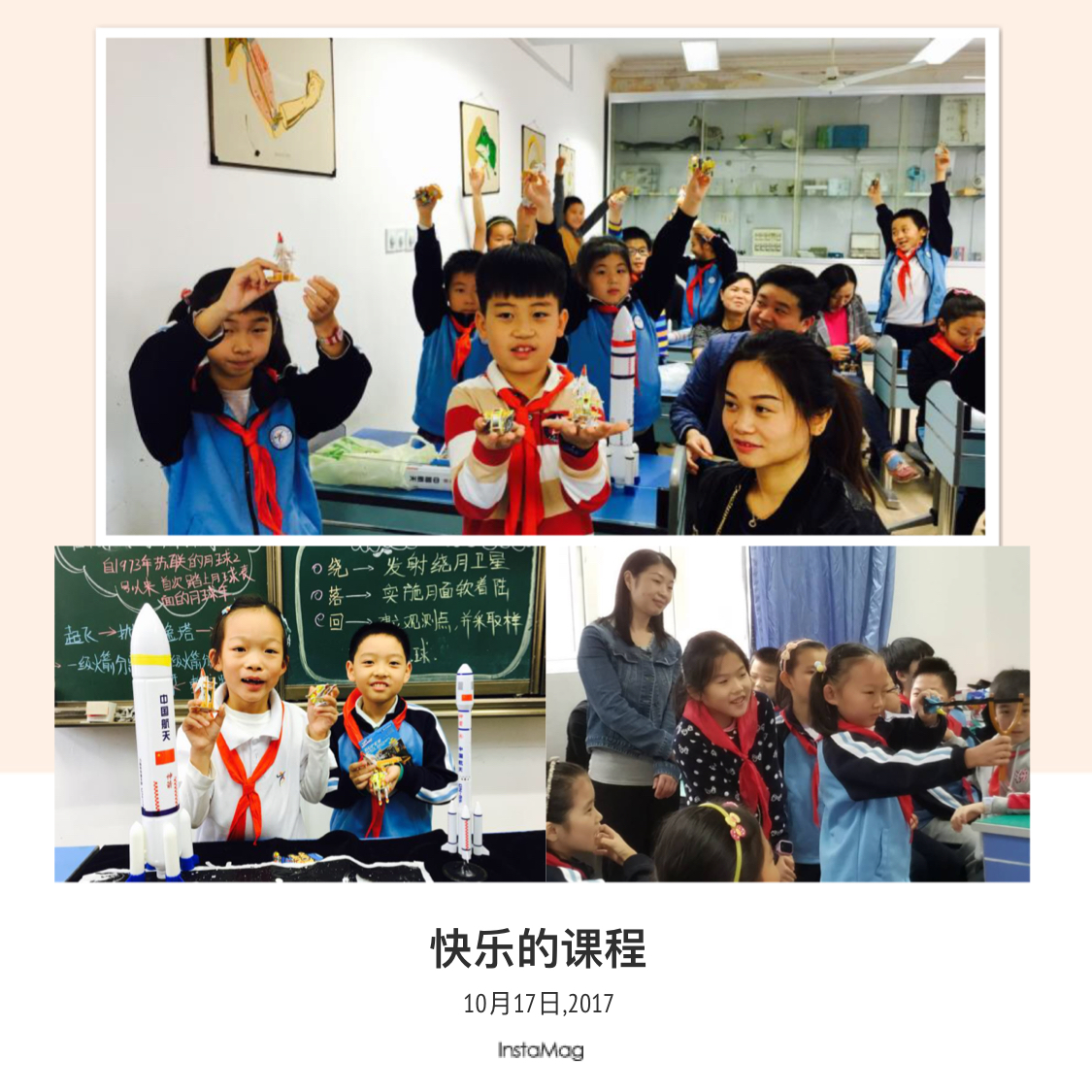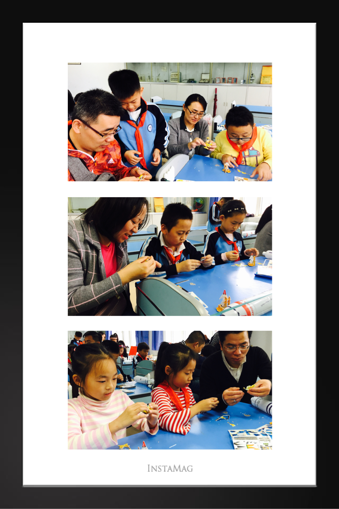 在自然室了,另一堂科学体验课也在活热地进行中。三(3)班的全体同学安静、有序地进入教室,见到早已等待的家长们,他们露出了绚烂的笑容。体验课由台湾力翰科学教育机构课程部的美人鱼老师(许静女士)带领,她幽默风趣的语言一下子就把同学们吸引进了今天的课程。美人鱼老师总结了上节“长征水火箭”的内容,并告诉大家由于天气的原因,不能带领大家到操场发射火箭,课程内容改变成“太空航天器模型”拼搭。看着老师早已准备好的一盒盒立体模型,同学们个个跃跃欲试,集体欢呼!讲解完拼搭要求后,第一个问题来了:航天火箭是由哪些部分组成的,最终飞上太空的是火箭的哪个部分?同学们反应迅速,小手举地高高的,个别同学小屁股都离开了板凳,争先恐后地回答问题。问题结束,火箭发射塔的拼搭开始。同学们小手灵活,拆下模型分块,一边与坐在身旁的爸爸、妈妈进行讨论协作,一边井然有序地拼搭着,现场气氛很是火热!这时的美人鱼老师也在不断地给大家加油鼓劲,班主任顾老师担任了“摄像师”的工作,把大家开心美好的画面记录了下来!有比较快的小朋友不到五分钟就已拼搭完成,完成后,按照老师的要求,双手平放在课桌上,作品摆在桌面上。发射塔拼搭完成后,第二个问题:人类为什么要到太空去,那么到了太空后怎样进行勘察?就这样,美人鱼老师成功引进了第二个模型“月球车”的概念,了解了月球车的结构后,第二个拼搭开始。同学们井然有序地进行着,令人兴奋的是速度上明显地提前!完成后,同学们争先恐后地展示着自己的作品,脸上挂满了自豪的笑容!
