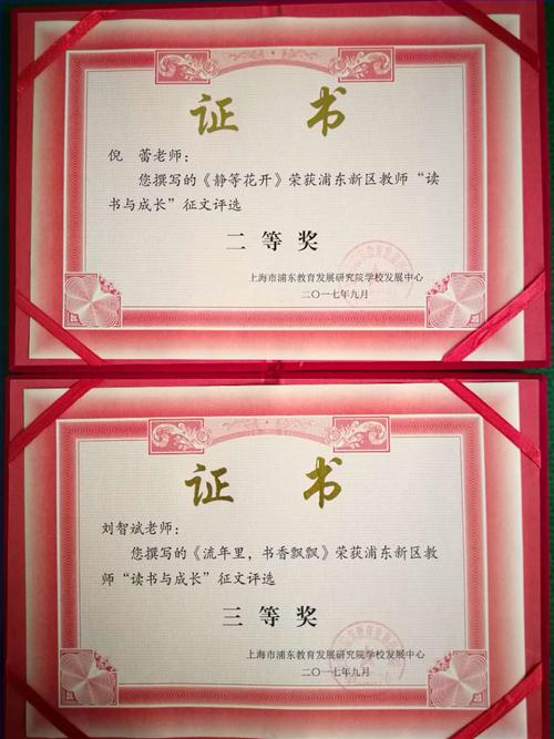 近日获悉,东方小学倪蕾老师的《静等花开》、刘智斌老师的《流年里,书香飘飘》在2017年浦东新区“读书与成长”征文评选中荣获二等奖和三等奖。10月24日下午,浦东新区教科室在教发院组织了隆重的颁奖活动,真是可喜可贺!