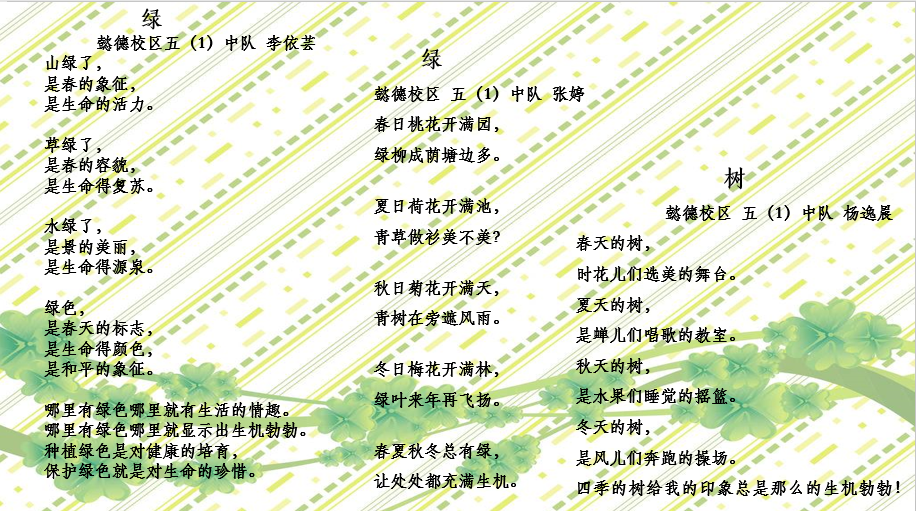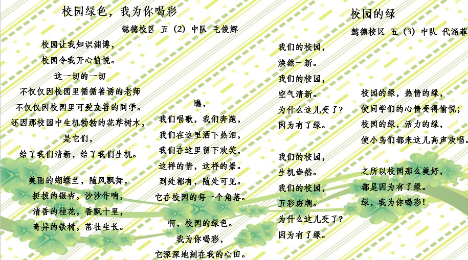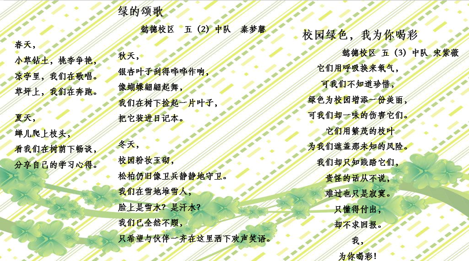 五年级的队员们不愧是大哥哥大姐姐了,他们用诗作来为校园绿色讴歌。各中队还推选了许多优秀的诗歌参与到学校《朗读者》栏目的录制中。那一首首优美的诗行展现了队员们的文学才华,洋溢着队员们对校园生活的热爱、对绿色的赞美和对生命的敬畏!