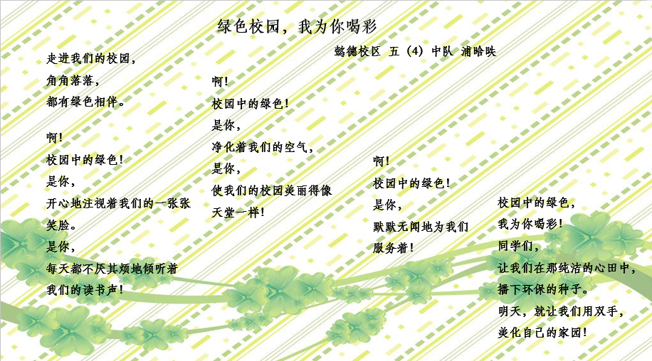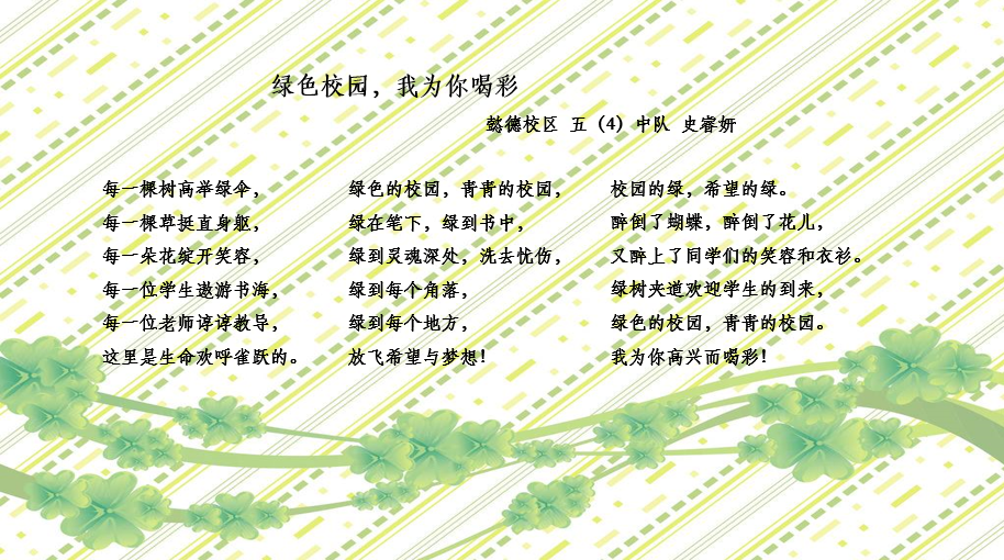 为校园绿色的美丽魅力喝彩,为校园生活的有趣可爱喝彩,也为那些让校园环境变得美丽、整洁的校工们、园丁们、老师们、孩子们而喝彩!