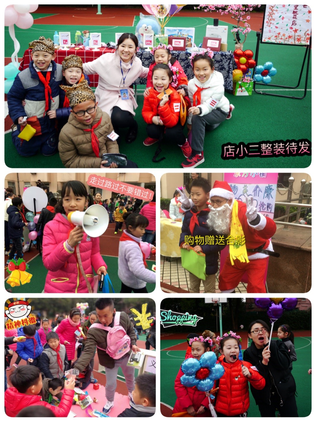 精心设计的海报广告,稚嫩的叫卖声,琳琅满目的商品,五花八门的促销……同学们将自己家中闲置的书籍、文具、玩具等以班级为单位摆成了一个个小摊位,精心布置成临时商铺。有的班级以圣诞和新年为主题,请来了圣诞老人和魔法师站柜台;有的班级以寻宝为主题,放置了酷眩的大轮盘进行现场抽奖;还有的班级以热播剧“三生三世十里桃花”为海报主题,巧妙嵌入了班级名称,孩子们亲手描绘大幅桃花主题海报、小小销售员们头戴桃花花环和店小二帽子、美丽的自制桃花树和桃花气球环绕店铺、连价格牌都是桃花图案主题的,引得众人连连赞叹。