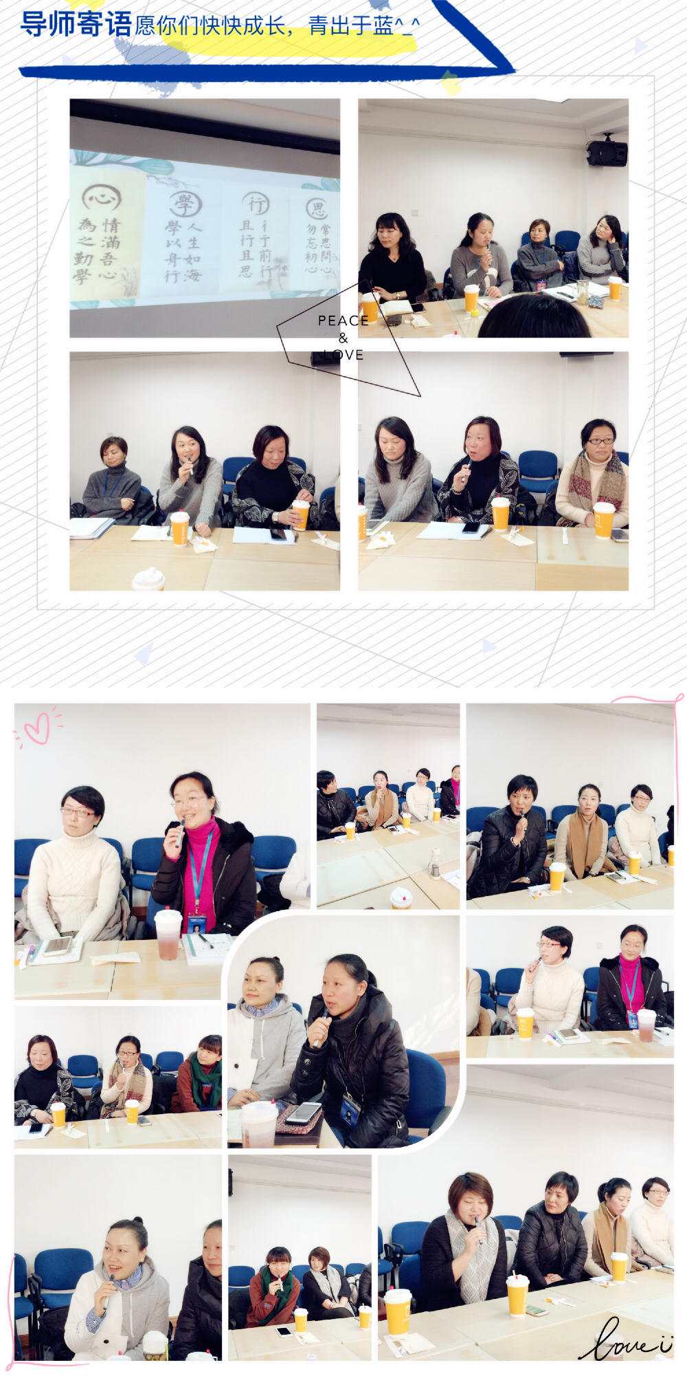 见习教师以一首《青春出发》的集体诗歌开启了会议的序幕,随后用一句甜甜的“师傅,您辛苦了!”送上一杯暖暖的热茶,感谢导师的悉心指导。时值岁末寒冬,可会议室内却爱意涌动,一派祥和气象。