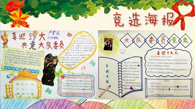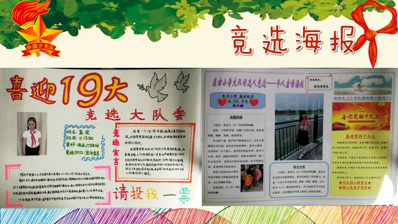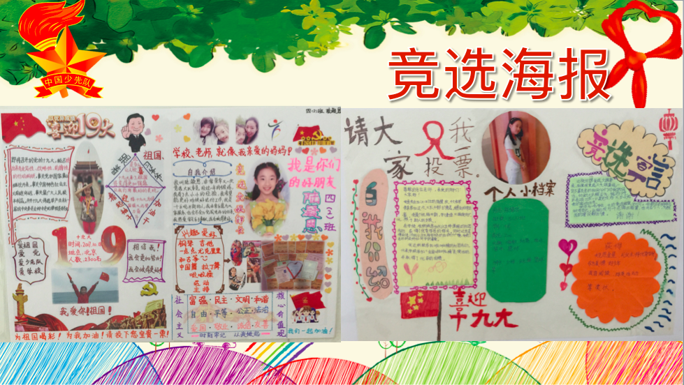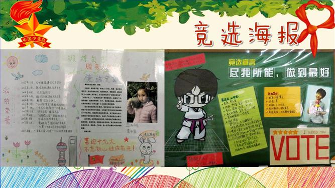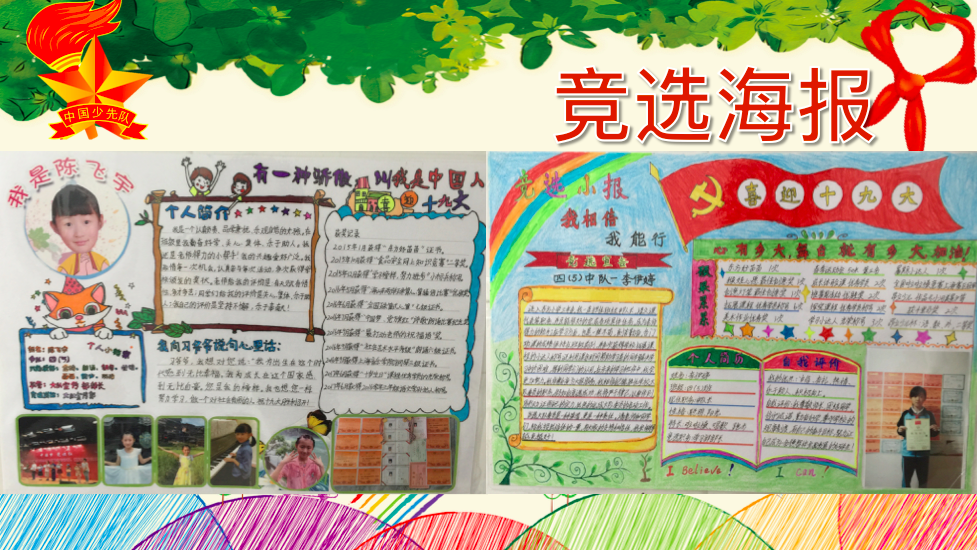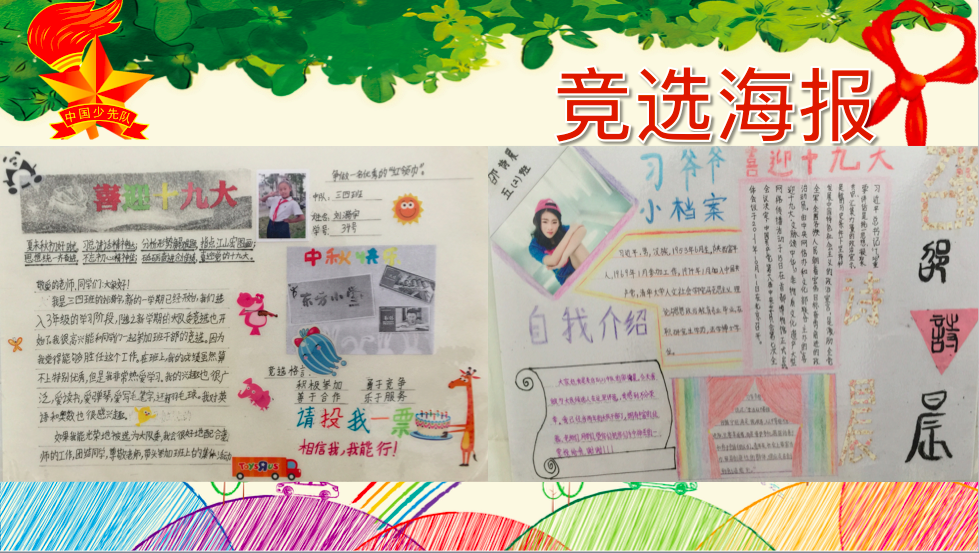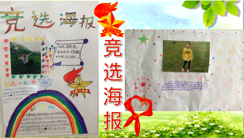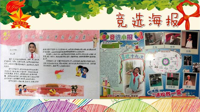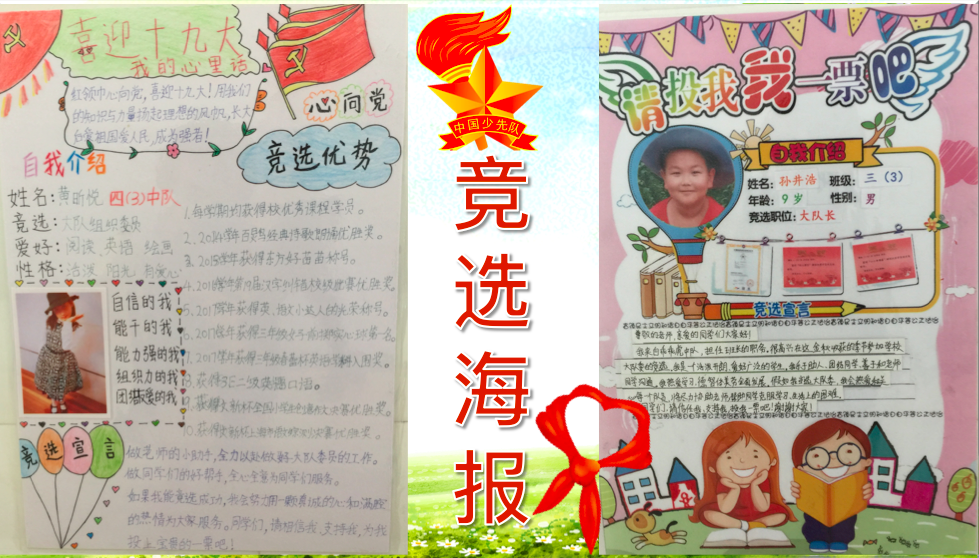 为了展示他们的个人风采,让全体少代表和队员们充分了解他们,候选人们精心准备了“推销”自我的精美海报,海报中包含了自我介绍、才艺介绍和队员们对十九大的理解和认识。