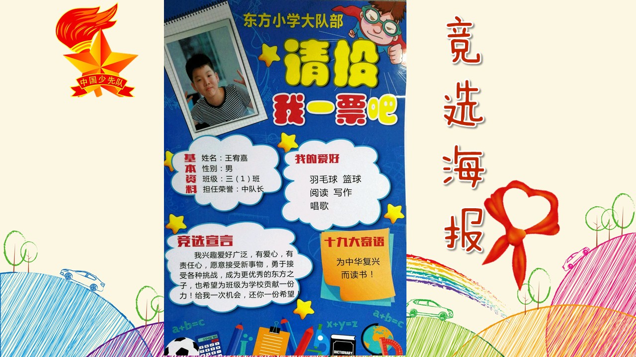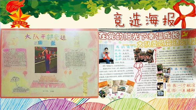队员们,你们发现了吗?每一位大队候选人的海报都是精心设计过的,不仅有打印部分,还有自己绘画、剪贴的内容!大家快来欣赏一下吧^_^