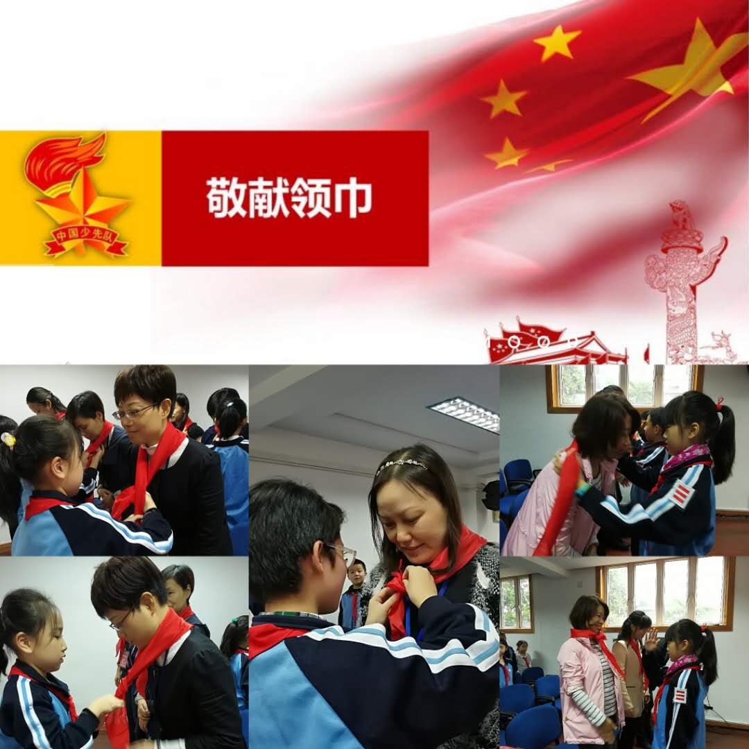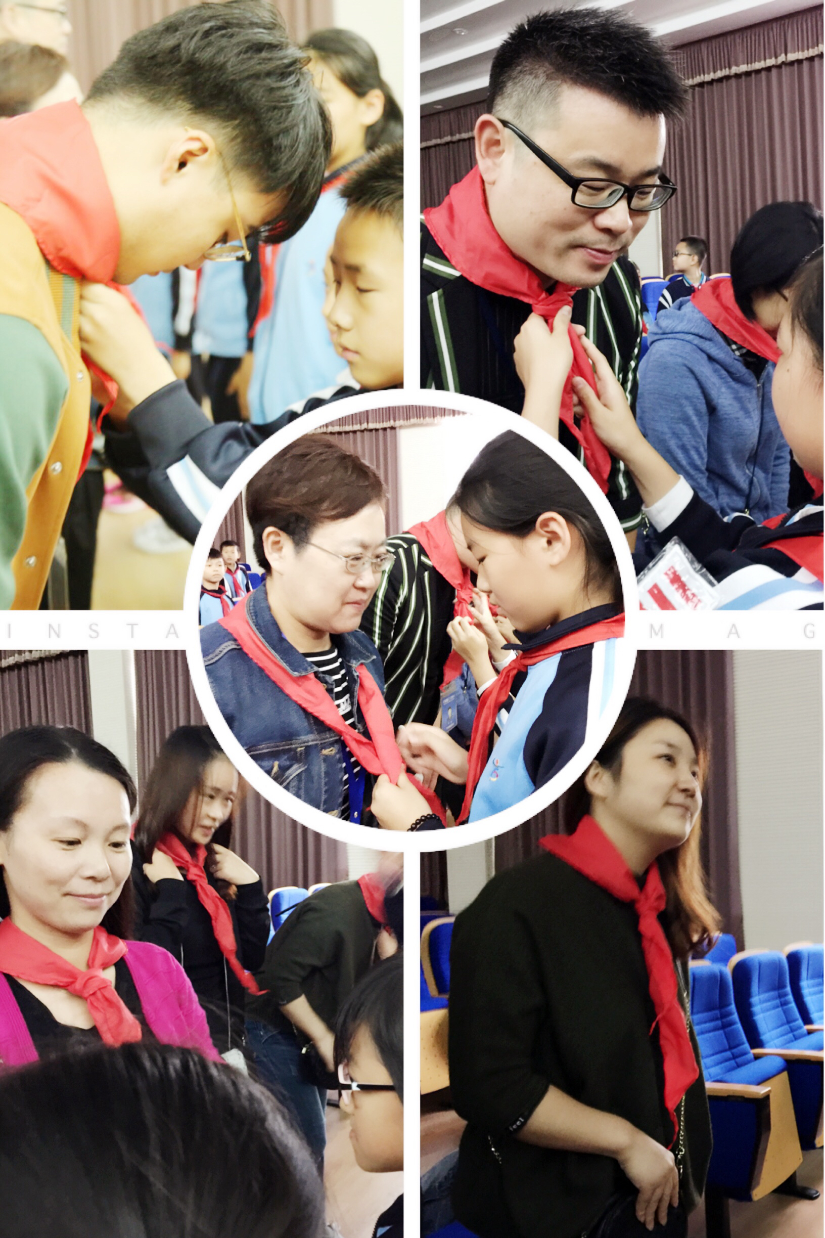 在隆重而欢乐的音乐声中,队员代表们为各位老师和家长献上了鲜红的红领巾!