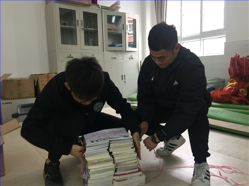 经过一周的时间,各中队都完成了50本图书的捐赠,送到了队室。随后,大队干部在党员、团员老师的帮助下,一起完成了所捐图书的捆扎工作。大家的额头渗出了汗珠,手指勒出了印痕,但是望着一捆捆图书,仿佛已经看到了西藏小伙伴手捧图书,开心地阅读着的画面,脸上都露出了欣慰的笑容。