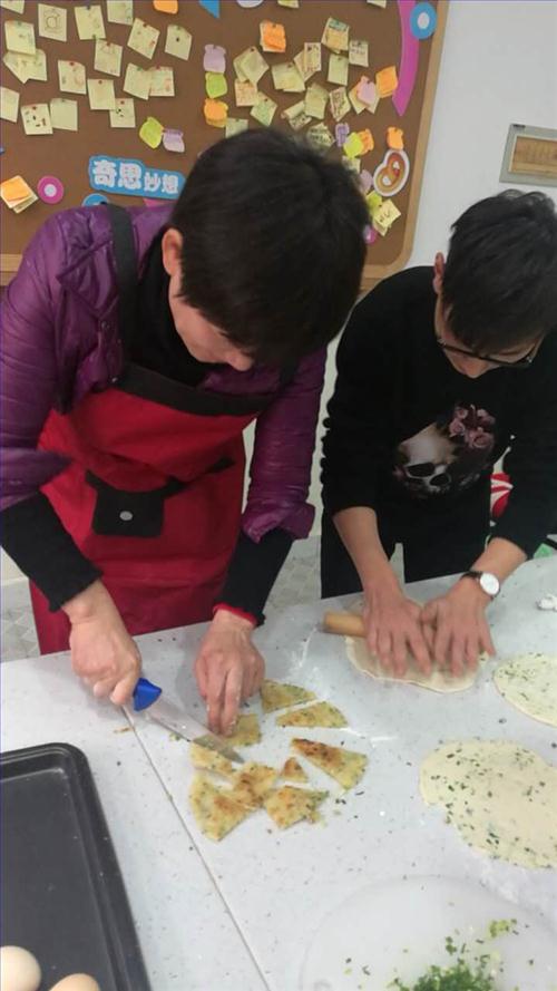 星期五下午,教师快乐烘培社团又有新活动啦!这次不仅有美味的瑞士卷,还有老上海的味道——-葱油饼。这次,刘娟老师把她的看家本领带入了烘培教室,让在场的所有老师都一饱口福。只看见面粉团在她的手中擀成薄饼,那青葱轻盈地洒在饼上,煞是好看;一捏,二揉,三卷,最后压一下,一个葱油饼就初步完成了,简单加工下就可以进油锅了。不一会儿,香喷喷的葱油饼就出锅了,老师们你一块我一块品尝着,根本停不下来。