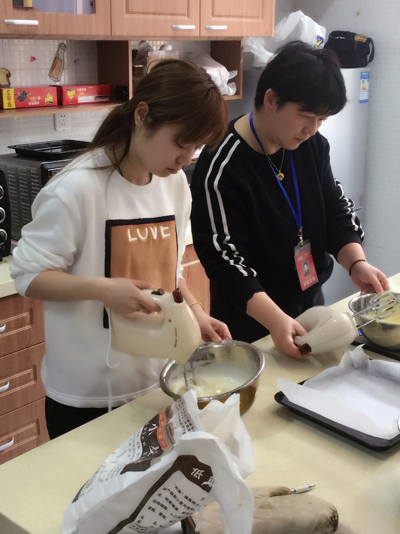 这边吃完,那边蛋糕片也在王维洁老师的指导下制作完工,马上出炉了。从起初的打蛋到烘烤,再给它涂上一层奶油,放点草莓,最后圈起来,切成一片一片入口清香,奶味十足的瑞士卷,老师们经历了互相帮助、合作的过程。教室中飘荡着教工们的欢声笑语。