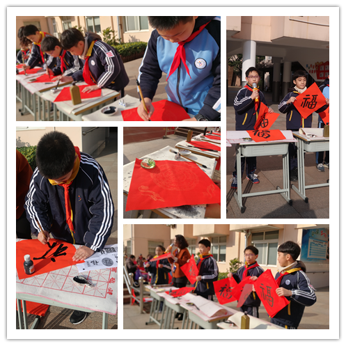 这边体验才刚结束,那边我们的东方小书法家们就为大家送上了他们的祝福。一幅幅现场书写好的“福”字送到了各个班级。红红的字代表着如意和吉祥。
