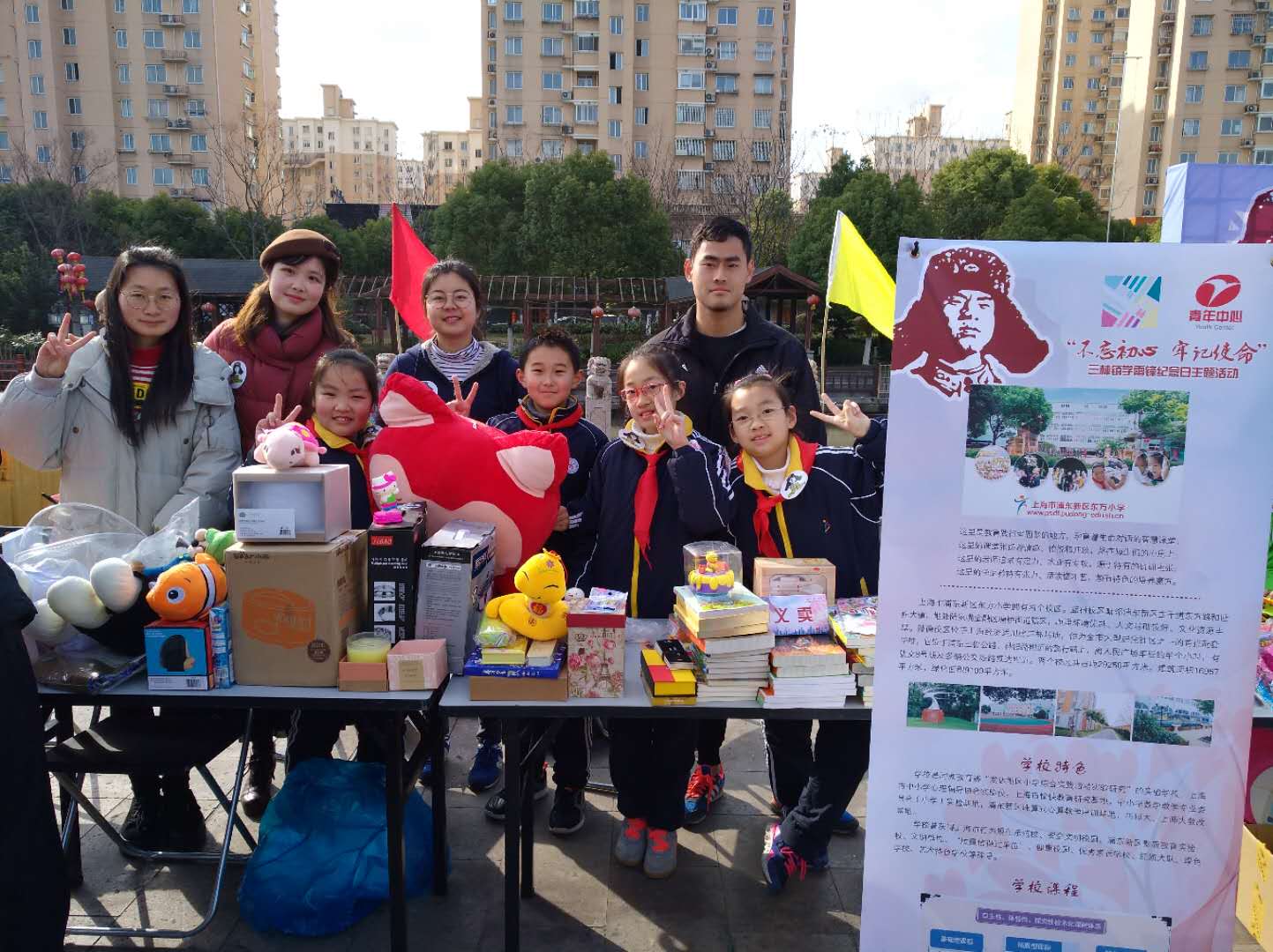 活动当天,迎着暖阳,由四名党团员和四名少先队员组成的东方小学慈善义卖小分队早早地来到三林老街,布置摊位,为义卖活动做准备。