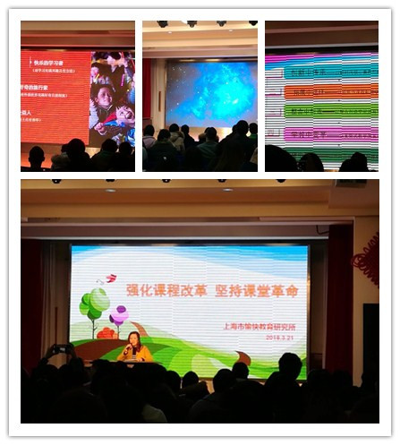 3月21日周三一整天,由上海市愉快教育研究所在静安区第三中心小学礼堂组织了一场题为《强化课程改革 坚持课堂革命》的经验分享会,沪浙两地近百所基地学校的部分骨干教师、管理人员800余人参加了培训学习。培训学习把课改深化的重点放到课堂教学,以七个不同类型学校的生动个案来演绎“愉快教育”的实践理想与各校办学实际紧密结合的美丽故事。