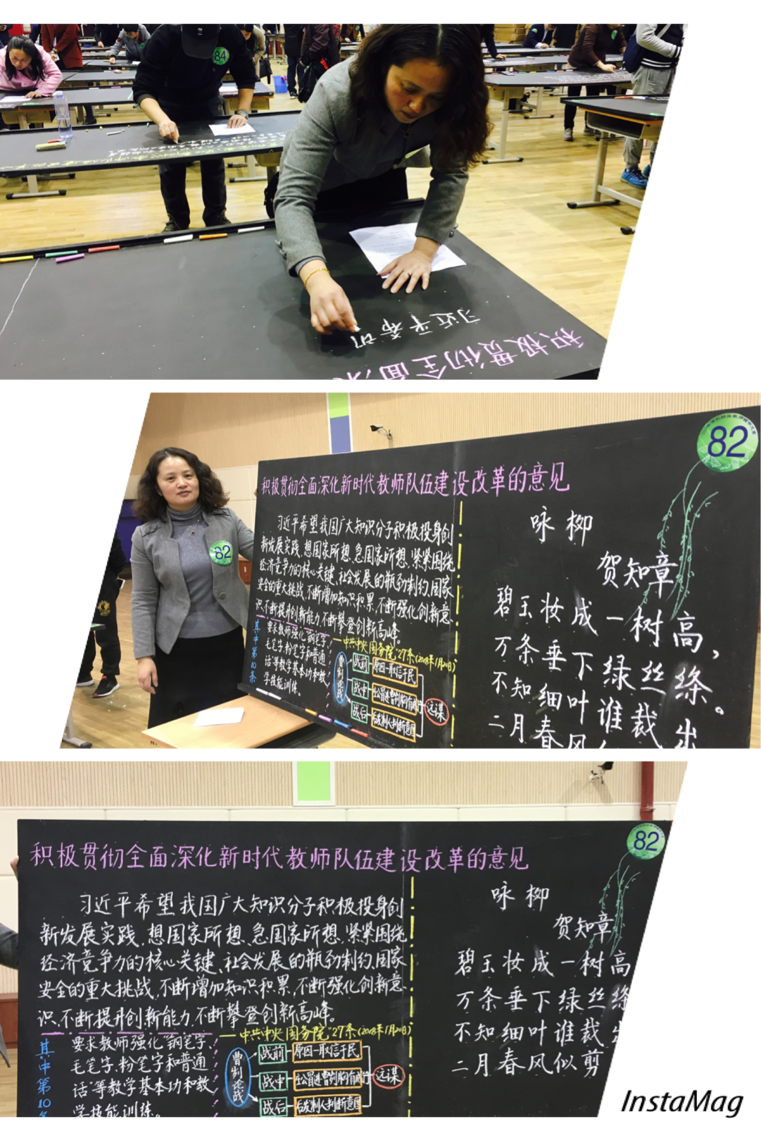 赛场上是高手如云,各种字体跃然板上,或楷或草或隶,有的飘逸潇洒,有的刚健雄劲……有的老师还有美术功底,独特的排版和漂亮的美化,更是让板书增色不少。