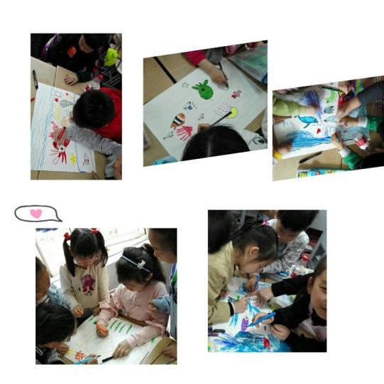 每一组都有一群小脑袋挤在一起,大家七嘴八舌地为团队出谋划策、各展所长:你画海草,我画鲨鱼,你涂大片海洋,我填细部颜色......
