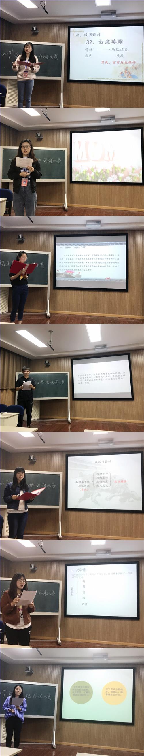 本次比赛共14名见习教师参加了角逐,每位老师进行10 分钟左右的说课。和以往的说课比赛不同的是,这次说课采用同课异构的形式,即说课内容统一指定,大家就相同的教材内容进行不同的设计。就语文学科来说,共有7名老师就五年级的一篇课文《奴隶英雄》进行说课。由于这篇课文文体独特,再加上比赛人数较多,很容易发生雷同。即便如此,参赛老师各个胸有成竹、沉着应战,相继登上讲台进行说课。教师们镇定从容、思路清晰,从教材、教法、学法、教学过程、板书设计等方面入手,配合着多媒体课件,全面地阐述说课内容。选手们的说课设计结构合理,重点突出,理论依据充分,表现出较好的驾驭教材、教学设计的能力以及良好的语言表达能力。