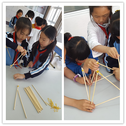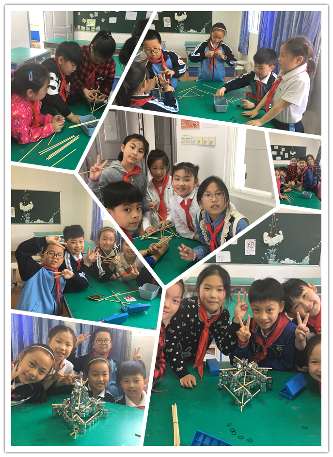 第4项是三年级的团体赛“木支架承重”项目,每班利用自然课的时间以小组的形式进行初赛,选出班中最强的一组参与决赛。5月3日决赛当天,选手们信心百倍地投身于比赛中:只见三(2)班的选手有的负责捏着木棒,有的负责绑橡筋,忙得不亦乐乎;三(3)班的选手也不甘落后,在组长的分配下,3个人负责完成支架的主体部分,其余2个人负责附件部分地搭建,整个过程有条不紊地开展着;三(1)班的选手们也是相互配合,相互协作,认真地完成支架地制作。随着时间的推移,在19分的时候,三(3)首先完成了支架的搭建,接着其他两个班级也陆续完成了作品。于是,激动人心的时候到了——开始挂砝码了。在老师的一声令下,角逐正式开始,“慢一点,轻一点挂。”“要挂得对称,不然重量会偏的。”……选手们的话语伴随着紧张的比赛。不一会儿又传来了大家的欢呼声,挂在支架上的砝码数量不断地被刷新:“我们挂了30个了。”“我们可是40个啰。”“太棒了,超过50个了。”……经过十多分钟的激烈竞争,最终决出了年级组的冠军——制作时间为19分钟,砝码数为67个。