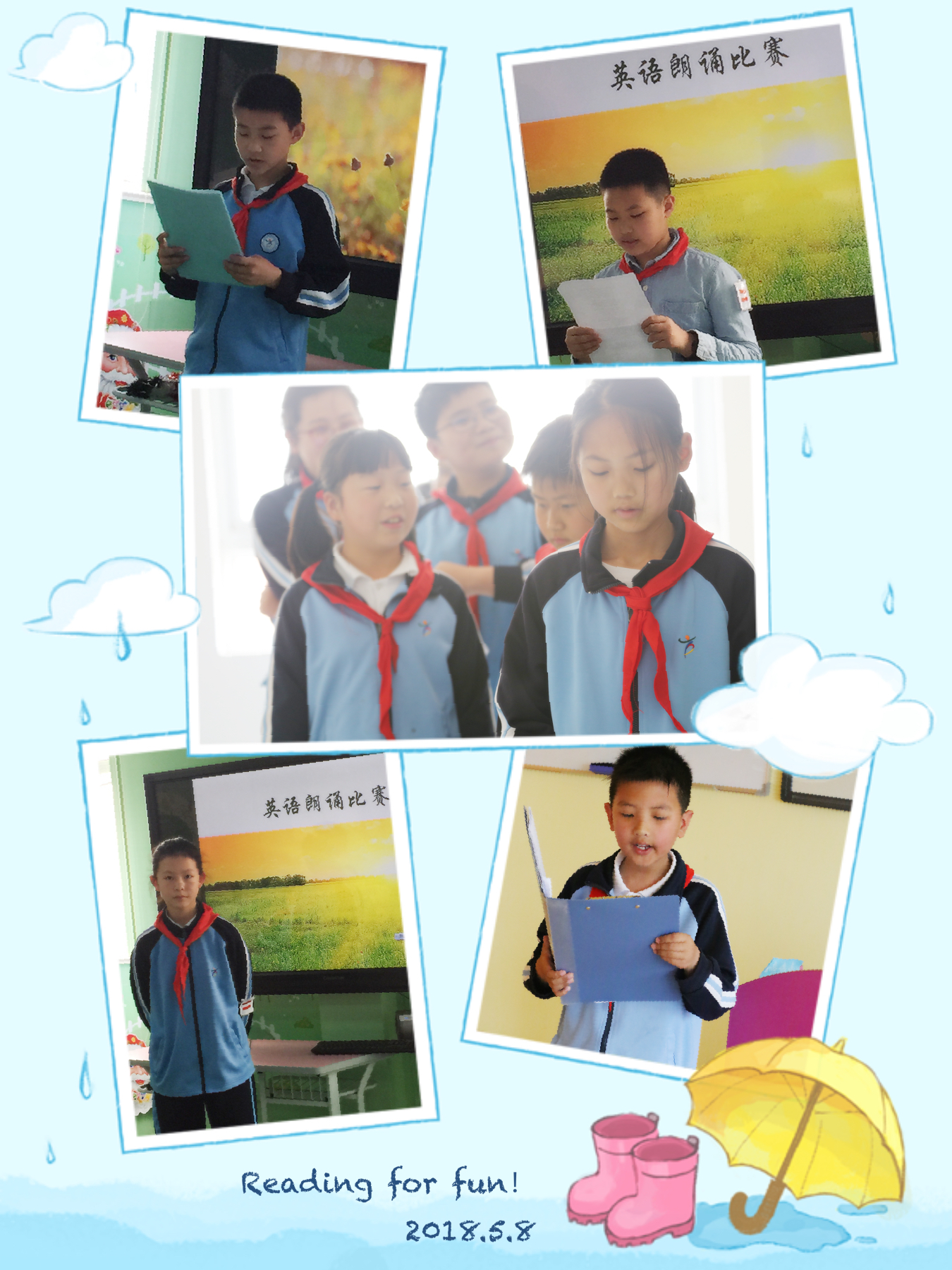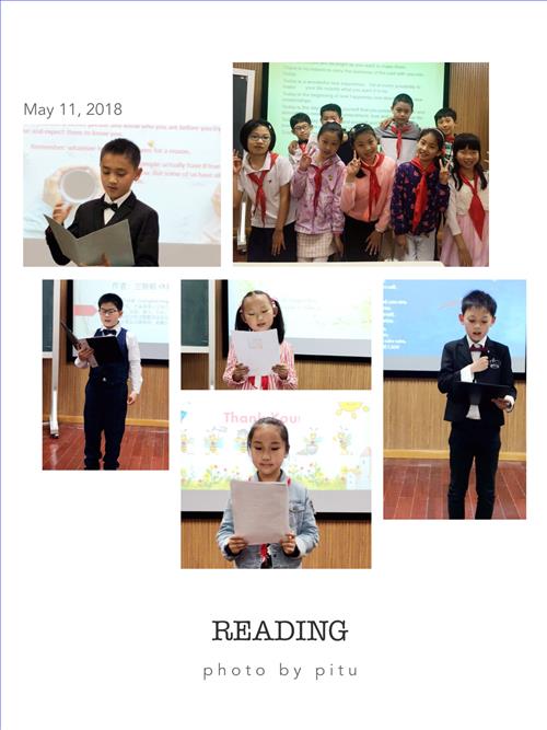 58日和9日两天,三到五年级英语朗诵比赛在期待声中正式启动。本次比赛旨在让学生通过朗读英语,领略语言文字之美,通过模仿跟读,改编或自创朗读文本,锻炼学生的口语表达能力,从而提高英语学习的积极性和自信心。经过一个月的朗读指导以及两周的班级海选,每班各有3名学生脱颖而出,进入决赛。决赛由英语组的老师担任评委,从语音语调、神态和意境、完整连贯性、配乐和原创性五个方面对选手进行评价。比赛当天,选手们个个神采奕奕、信心十足,或抒情朗诵,或激昂高歌,他们的精彩表现为观众与评委们带来了一场悦耳的听觉盛宴。