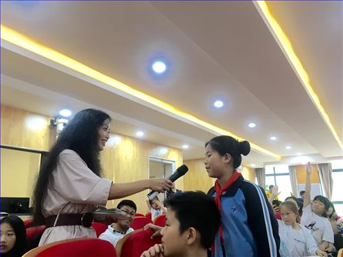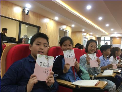 见面会上,辫子姐姐还和孩子们进行了不少的互动,让孩子猜想故事的情节发展;让孩子们用比喻来说“最薄的书”到底有多薄;让孩子们猜别人给她取了什么绰号……印象最深的是猜猜她为作品中的人物取了什么名字,没想到四个人物的取名竟然来源于两个菜:清蒸扇贝。故事的主人公叫扇贝;主人公的急性子妈妈叫蒜泥妈妈;主人公的好朋友,一个可爱干净的女孩叫葱花;而主人公所样的宠物猪就叫荷包蛋。在一阵欢乐的笑声过后,孩子们也明白了写作需要丰富的想象力,需要对生活点点滴滴的关注和感悟。
