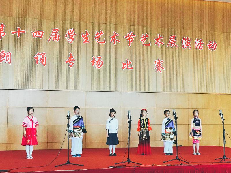 在5月24日上午的朗诵大赛中,伴随着缓慢悠扬的旋律,蓝村校区朗诵社团成员身着不同民族的服装在舞台上抑扬顿挫地朗诵起《我有祖国,我有母语》。孩子们声情并茂,慷慨激昂,深情款款。虽然每个小朗诵者来自不同的班级,但却无一不展现出东方学生优秀的综合素养和出众的精神风貌。优美的意境,优雅的表演,优质的诵读给观众们献上了一场震撼心灵的听觉与视觉的盛宴。