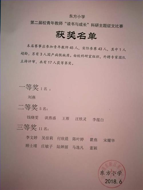 为了交流分享教师读书与成长的经历和经验,探讨教师阅读与专业发展的方法和路径,结合学校发展和青年教师培养工程的需要,举办东方小学第二届青年教师科研主题征文评选活动,要求本校35岁以下(含35岁)青年教师全员参加。征文素材可以是读书的经历,可以是读书与工作及研究的关系,可以是读书与交流,也可以是关于教师阅读现状的调查和评论……。本届征文评选不包括书评或读后感一类文章。在征文内容和形式上一反往日的面孔,赋予了时代的元素和教师成长的新要求。