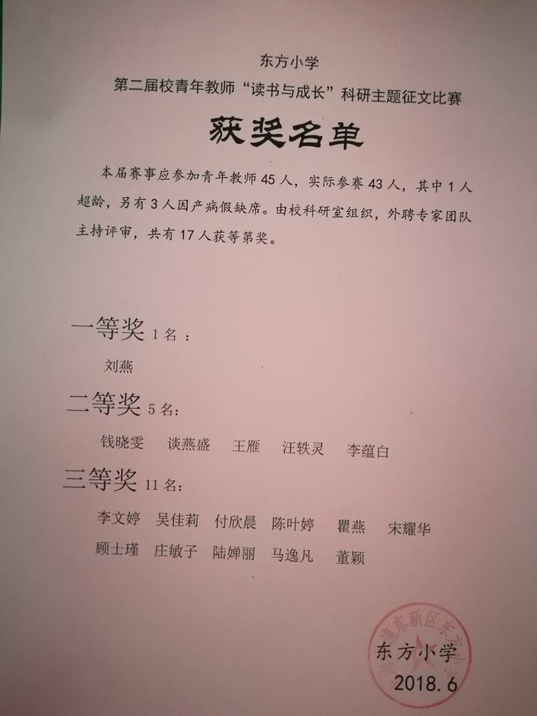 本届赛事应参加青年教师45人,实际参赛43人,其中1人超龄,另有3人因产病假缺席,共有17人获等第奖。