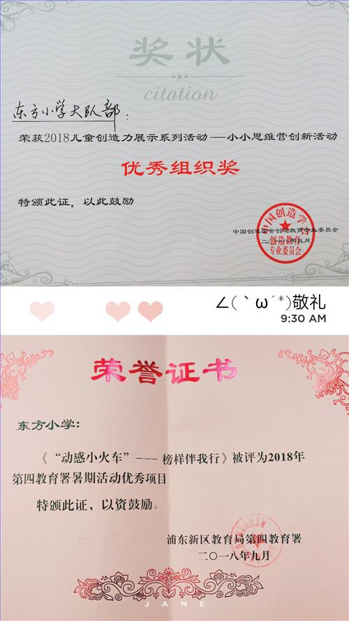 学校大队部因活动组织出色喜获中国创造学会创造教育专业委员会“小小思维应创新活动”优秀组织奖;《“动感小火车”——榜样伴我行》暑期活动获浦东新区2018年第四教育署暑期活动优秀项目奖。