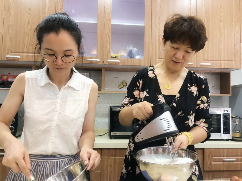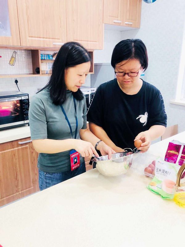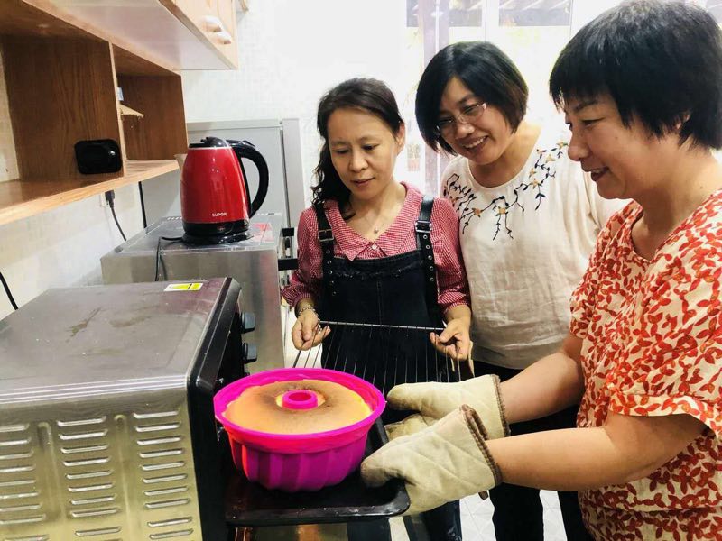 没过多久,就闻到了蛋糕飘出的淡淡奶香味,在等待的过程中,老师们互相交流着烘培带来的乐趣,烘培教室充满了老师们的轻松惬意的欢笑声。只听“叮”得一声,老师们凑到了烤箱前期待着蛋糕从烤箱取出的那一瞬间,那种乐趣无以言表。