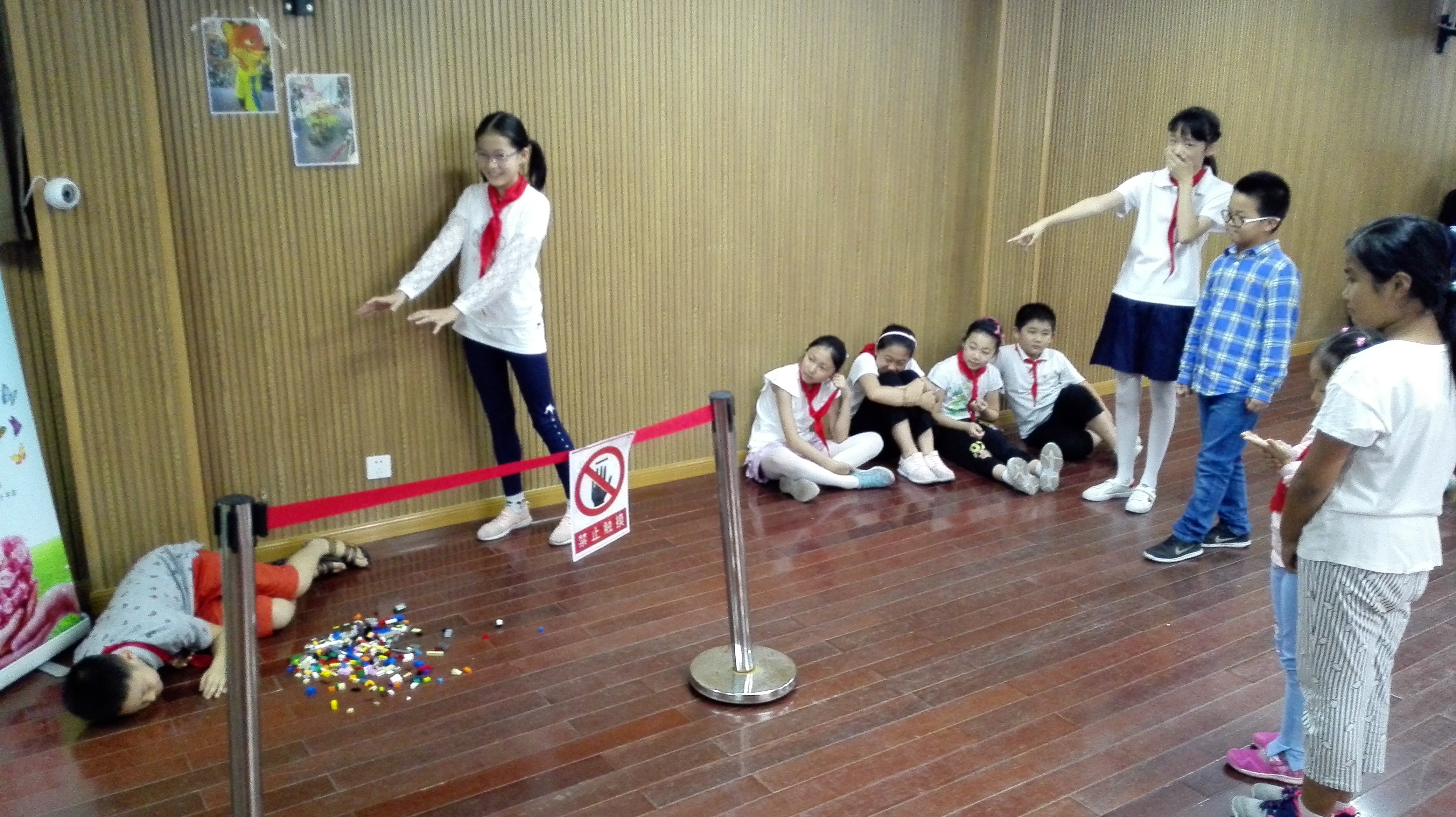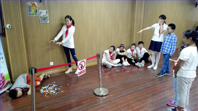 教育戏剧里最关键的是定格,也就是人物雕塑。引导员先从熟悉的环境切入,问:“学校里有什么?”学生们用自己的身体塑造不同的事物,引导员不断强调要让自己定格:不出声、不笑场、不乱动。接着用身体塑造公园里的事物。最终揭开主题的面纱——展览馆里有什么,通过身体雕塑,孩子明白了展览馆里独有的事物:玻璃罩、安全护栏、保安、标志……。