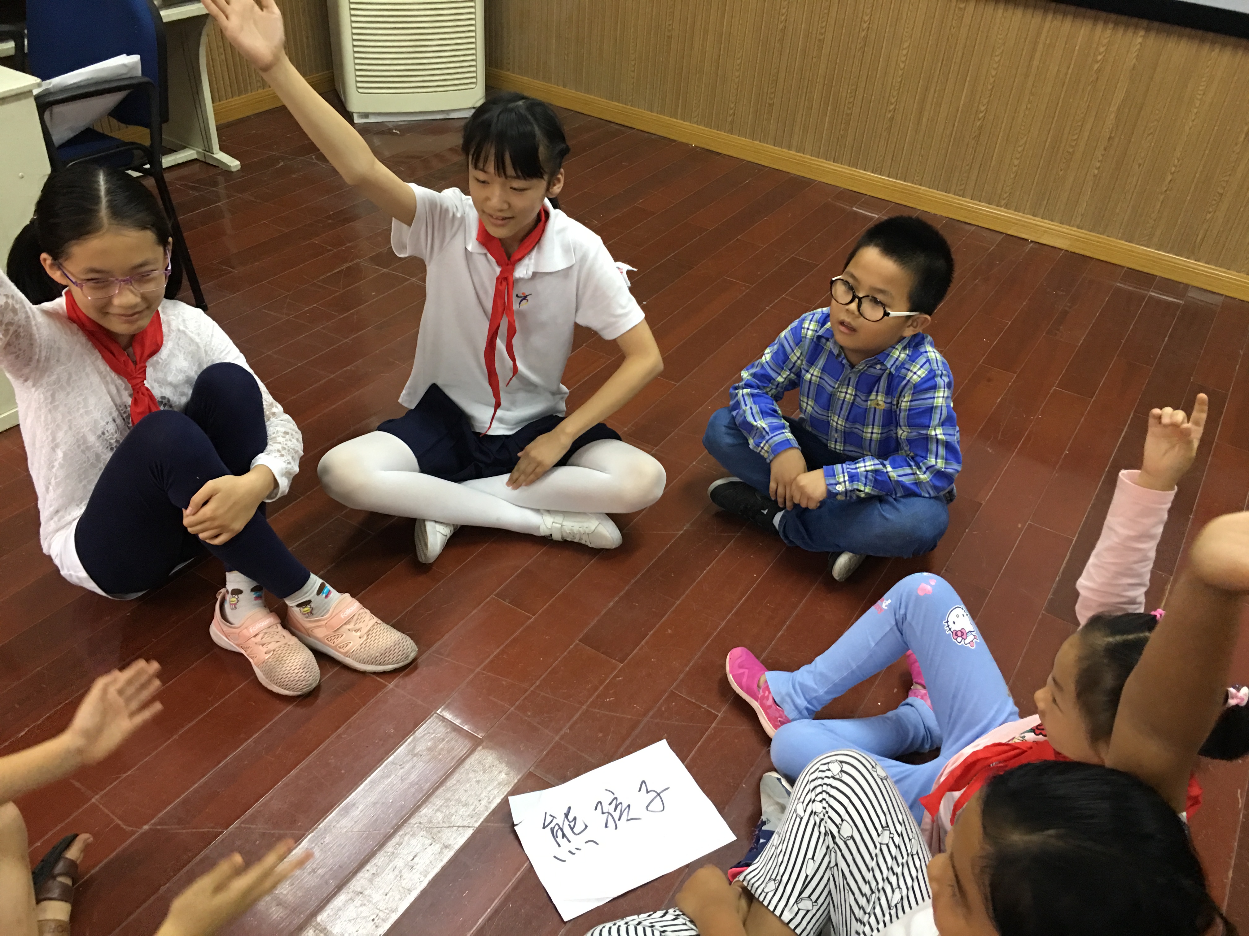 孩子们来自不同班级,需要热身游戏暖暖场。不过在游戏开始之前,确立规则最重要:“一人说,众人听”,这也是教育戏剧所强调的和谐关系的前提。接着就是孩子们喜爱的热身游戏环节:“几个人来了”的游戏考验孩子的专注力,笑声此起彼伏,玩得不亦乐乎。接下来的两个游戏都是为今日主题做铺垫。“用数字调整步速”不仅考验学生的专注力,还考验学生的想象力,学生边走边想此刻的步伐代表什么含义,你为何步履匆匆?又为何放慢脚步?初步引导学生思考。“一声男生停,两声女生停,三声全部停,四声跳完继续走”让学生在走走停停中逐渐放松身心,为更好地融入活动做了充分的准备。