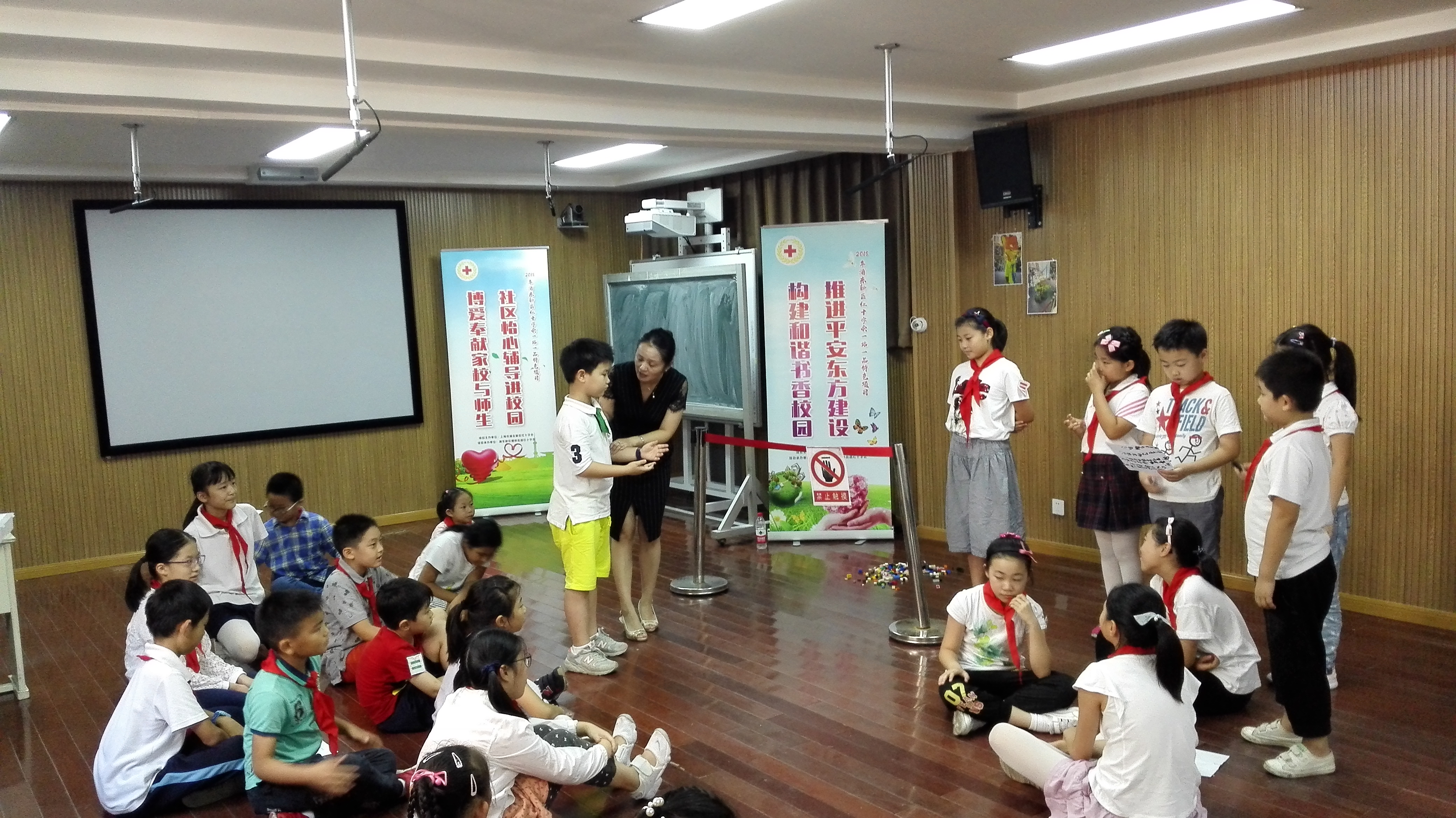 刚过中秋,将迎国庆,又恰逢一年一度的秋游,孩子们的心都飞出了校园。不过,有一群娃却没有着急回家,而是欢乐地来到二楼录播室,开启一次快乐之旅。家长们也一同走进东方小学教育戏剧工作坊,一同走进“展览馆”。这既是一次礼仪与主持班的社团开放,也是东方小学与塘桥社区“一站一品”特色项目合作的一次活动。