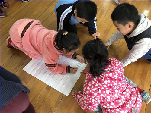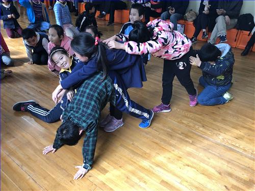活动开始前需要热身游戏暖暖场。不过在游戏开始之前,确立规则最重要:“锣鼓锣鼓响起来,眼睛眼睛看老师”,“你说我听,我说你听”,这也是教育戏剧所强调的和谐关系的前提。孩子们最喜爱的游戏环节开始了:第一个游戏“几个人来了”有意识地锻炼了孩子们的专注能力,孩子们需要细致观察,灵活动脑才能完成得很好,大家都投入到了游戏中去,玩得不亦乐乎,不时传出此起彼伏的笑声;第二个游戏“我喜欢怎样的人做我的朋友”比较轻松,让孩子们集中了精力,教师耐心引导孩子们的语言表达和认真倾听能力;还有“几色花儿开” 分组游戏,不仅能够为学生快速分好组,还锻炼了孩子们的反应能力和团队协作能力。学生在这些暖场游戏中逐渐放松身心,积极性也被调动出来了,为更好地融入活动做了充分的准备。