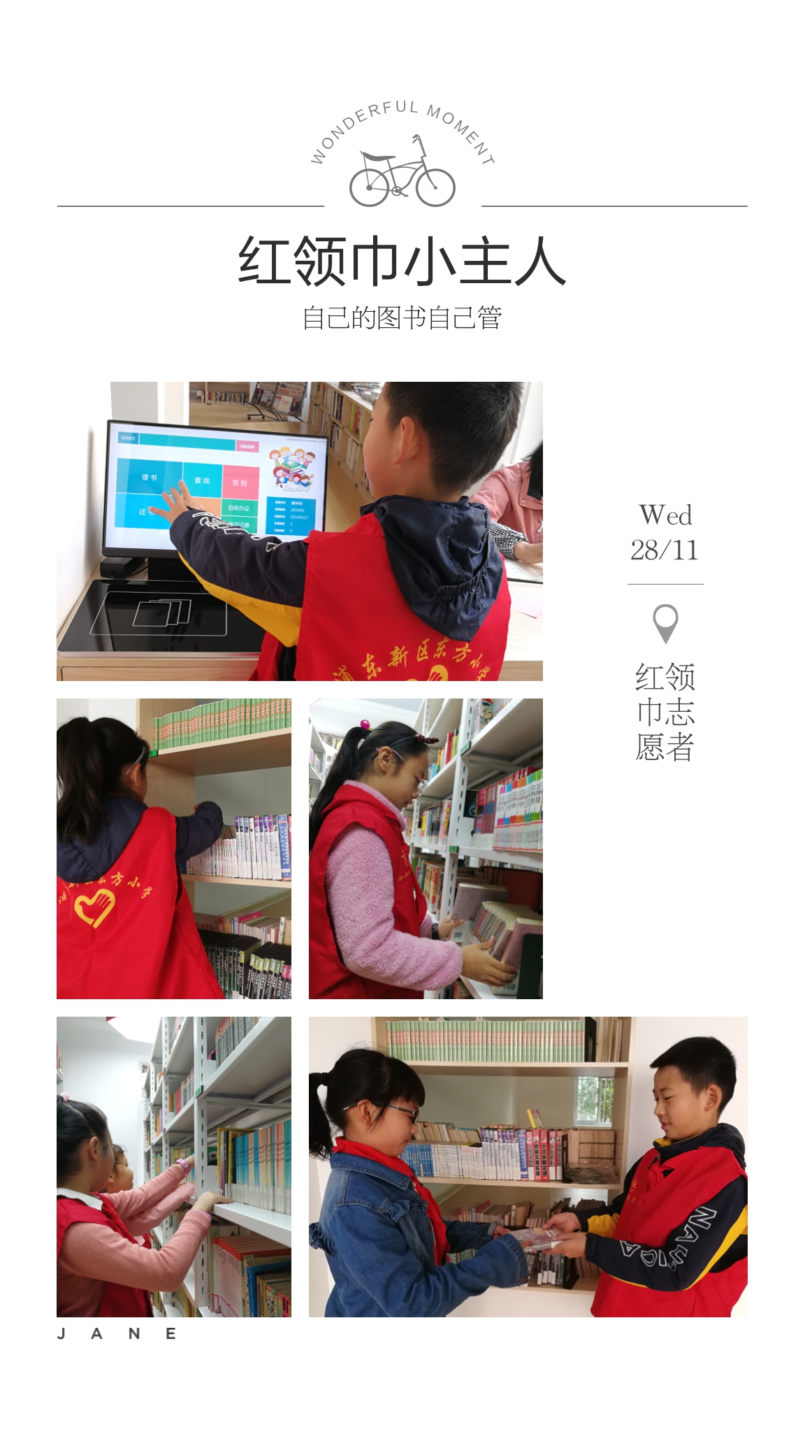为了让每个学生便利借阅图书,满足每个孩子课外阅读的精神需求,让学校图书馆成为孩子们向往的地方,少先队大队部派出了优秀的队干部担任图书服务志愿者,并列出了服务岗位表,使之成为一项少先队自我服务、服务他人的培训任务, 拓展了“一条杠杠一份责任” 践行领域。