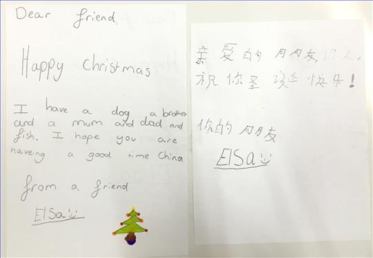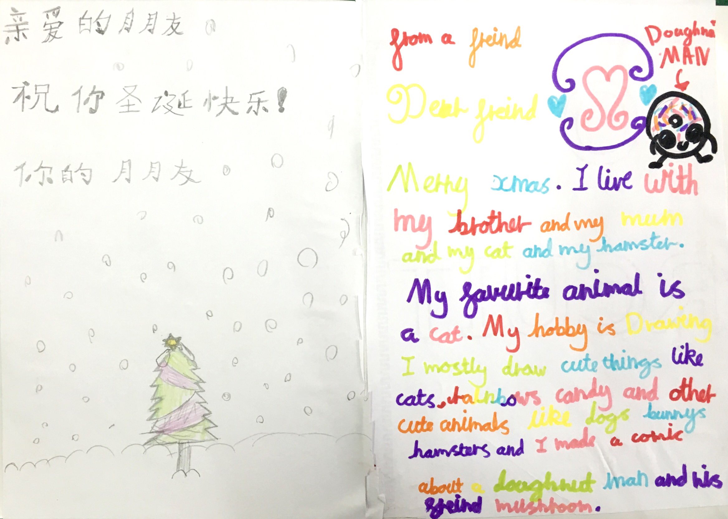 时光又过去了一年,继上一次的中英联谊笔友活动后,今年东方小学收到了来自英国Bignold Primary School的圣诞大包裹!带着满满的期待,老师们迫不及待地打开了包裹:哇!有汉字作业?还有书法?贺卡上还有用中文写给东方小学学生的名字和祝福?!这确定是英国小朋友寄给东方小学的礼物吗?同学们发出了阵阵惊叹声:“这怎么可能呀?”