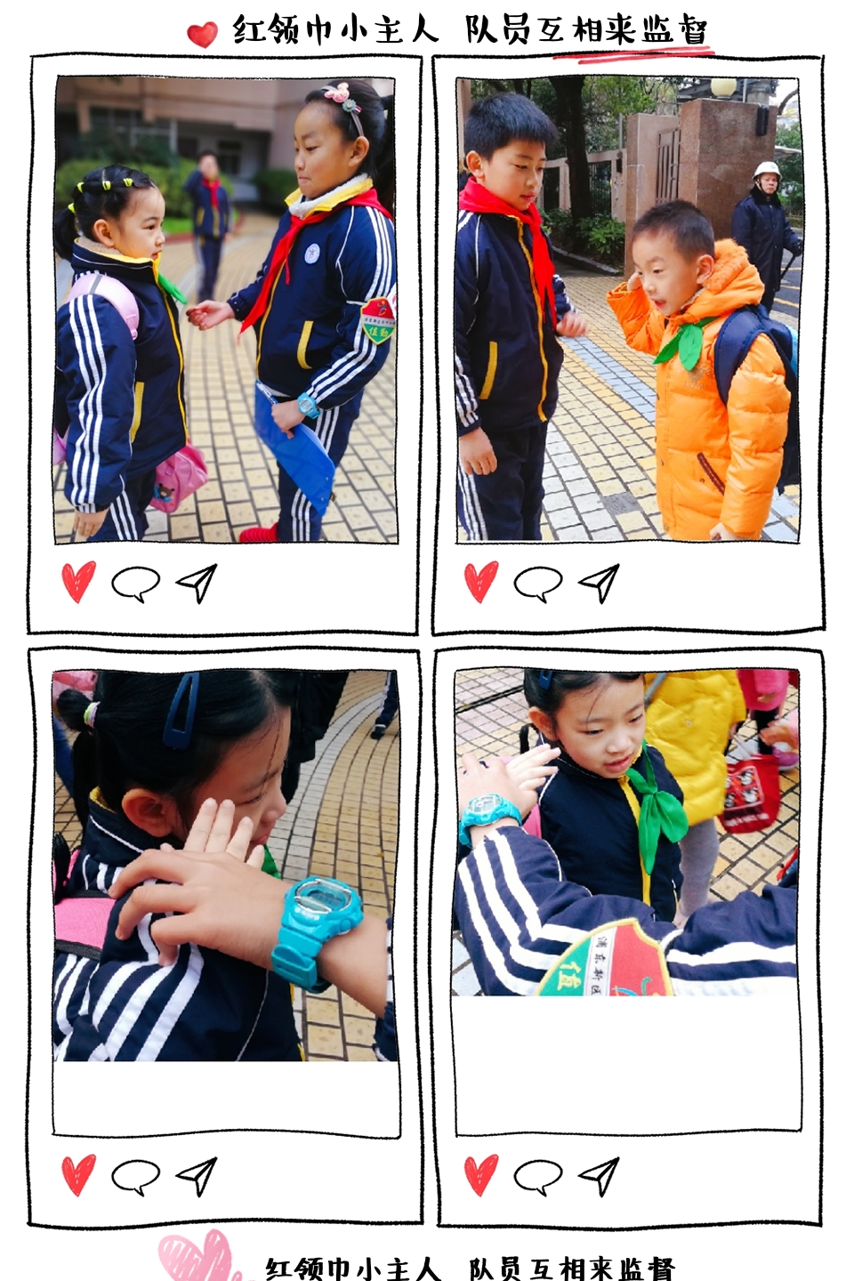 倡议发出之后,队员们互相监督,互相帮助,在校园内劝阻不佩戴、不爱护红领巾等行为;在监督中,队员们发现在爱护红领巾的同时还需要规范自己的言行,例如:提醒同学时的音量放轻;看到佩戴绿领巾的队员还主动问好;遇到不会正确戴领巾低年级的弟弟妹妹们会主动教他们戴红领巾的正确方法,当了回真真正正的小榜样!