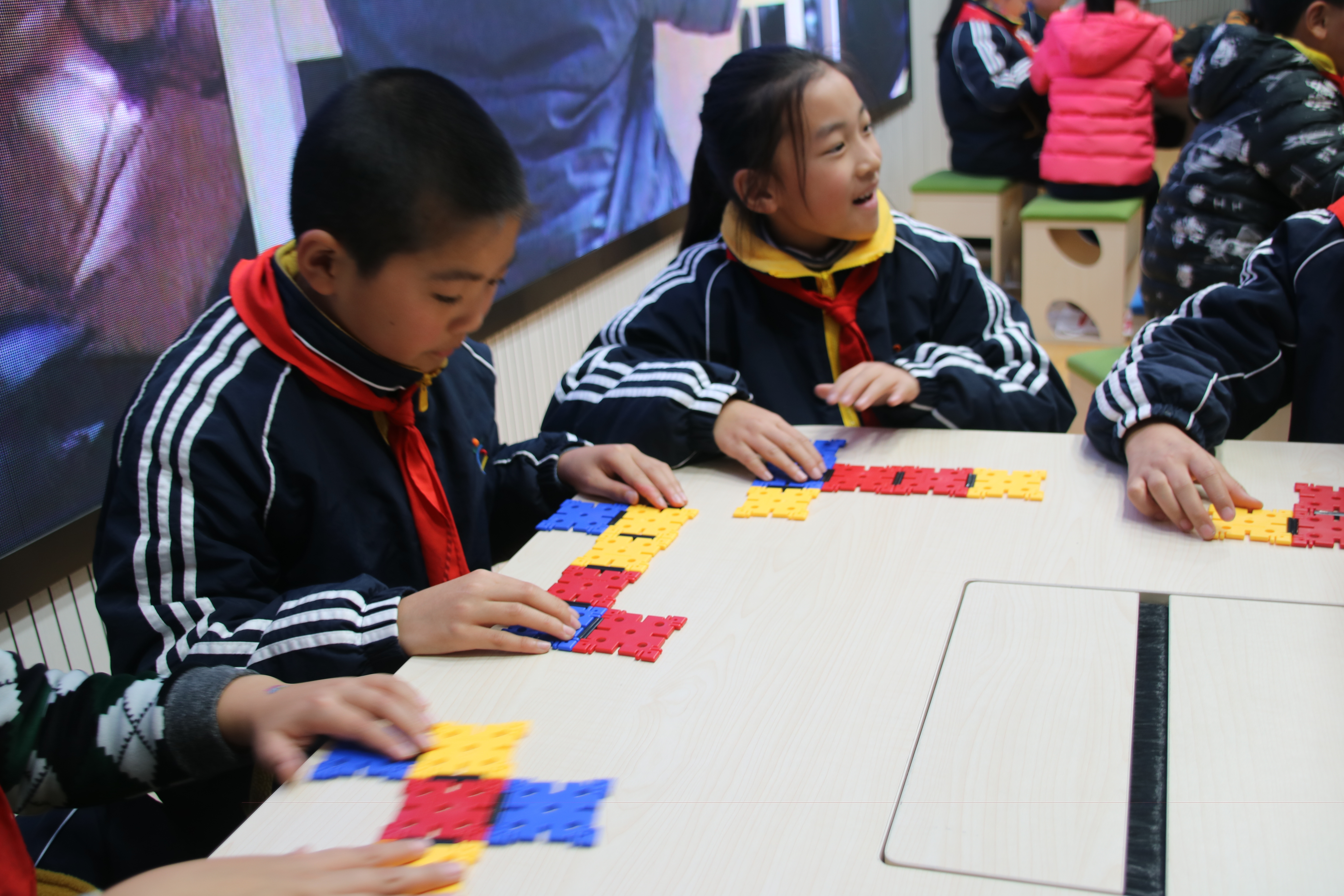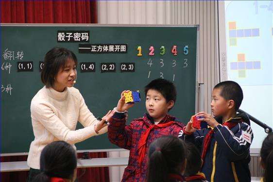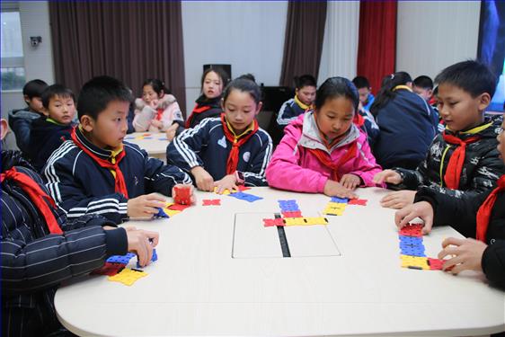 在教材中,正方体展开图是五年级下册的内容,而参与这堂课的则是四年级的学生,不过在超脑麦斯课程学具的帮助及老师的引导下,学生们通过动手操作、观察思考,探究出了11种正方体展开图。生动有趣的“加分环节”、丰富多彩的“学具操作”,让学生真正体会到了“玩中学”的乐趣。整堂课中,不仅台上的学生们忙着摆弄手中的学具,台下的老师们也没闲着,两两合作,共同参与了整个学习过程,切身感受了一次“超脑麦斯”。
