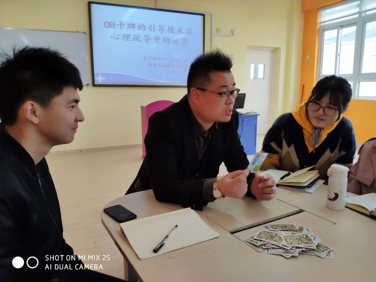 齐悦老师介绍了教师对学生进行心理疏导的各种手段,着重推荐了OH卡牌的使用,通过与见习教师进行面对面的心理疏导,让各个见习教师学习了心理疏导的提问策略,体会了被疏导者的心理状态。同时展示了完整的心理疏导过程,什么问题让学生放松,如何给学生的心理问题定性,什么时候正式对症下药,并且还包括新教师常犯的错误。