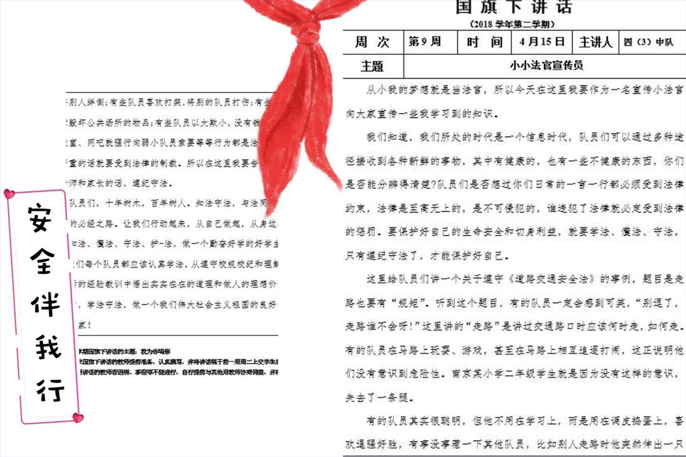 4月15日一早的升旗仪式中,来自四(3)中队的两位队员就首当其冲,化身为“宣传小法官”,倡议队员们认真学法,从遵守校规校纪和理解父母师长做起,从生活的经验教训中总结道理,踏踏实实地去实现自己的梦想。