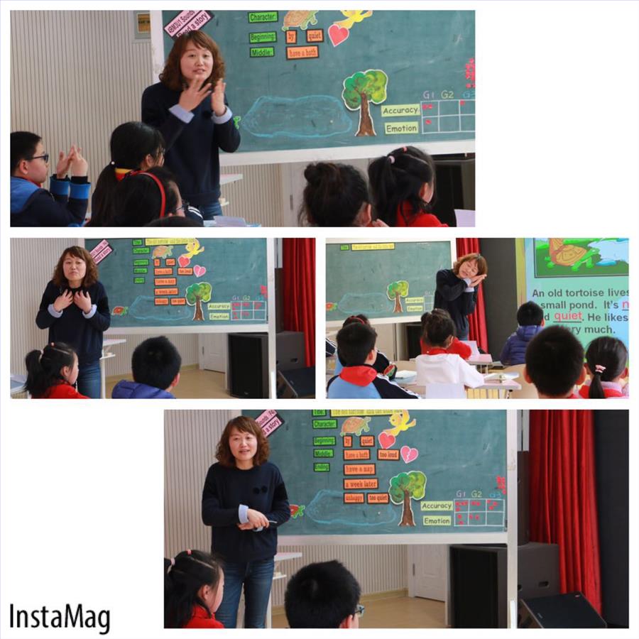 黄芳老师本次是借班上课,执教的内容是4B M3U1Sounds(Period4)The old tortoise and the little bird。黄老师自身的教学素养,尤其是精准、简洁的课堂教学语言、轻松自然的教态、循循善诱的教学方式给听课老师留下了深刻的印象。黄老师非常重视学生在故事中的角色意识和合作意识的培养,哪个环节可以融入教育戏剧的元素,以及在回答完故事中的问题后如何让学生归纳总结,黄老师都事先进行了细致的思考。其实,在我们的牛津教材中有很多有趣的故事,夸张的语言,跌宕起伏的情节推进对乐于表达的小学生有着特殊的吸引力,学生渴望通过表演感受故事中人物的心情,同时,学生的感受力、表现力、理解力等综合素养都有所提升。