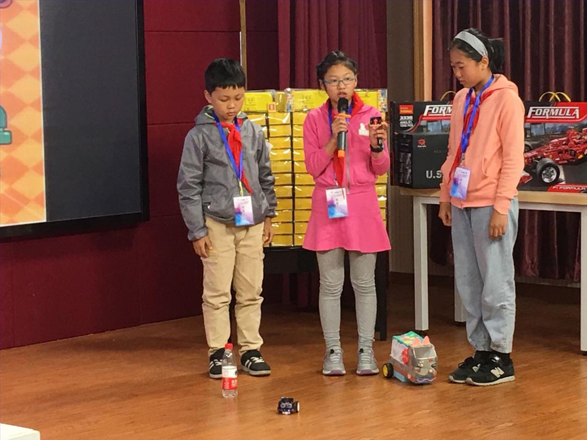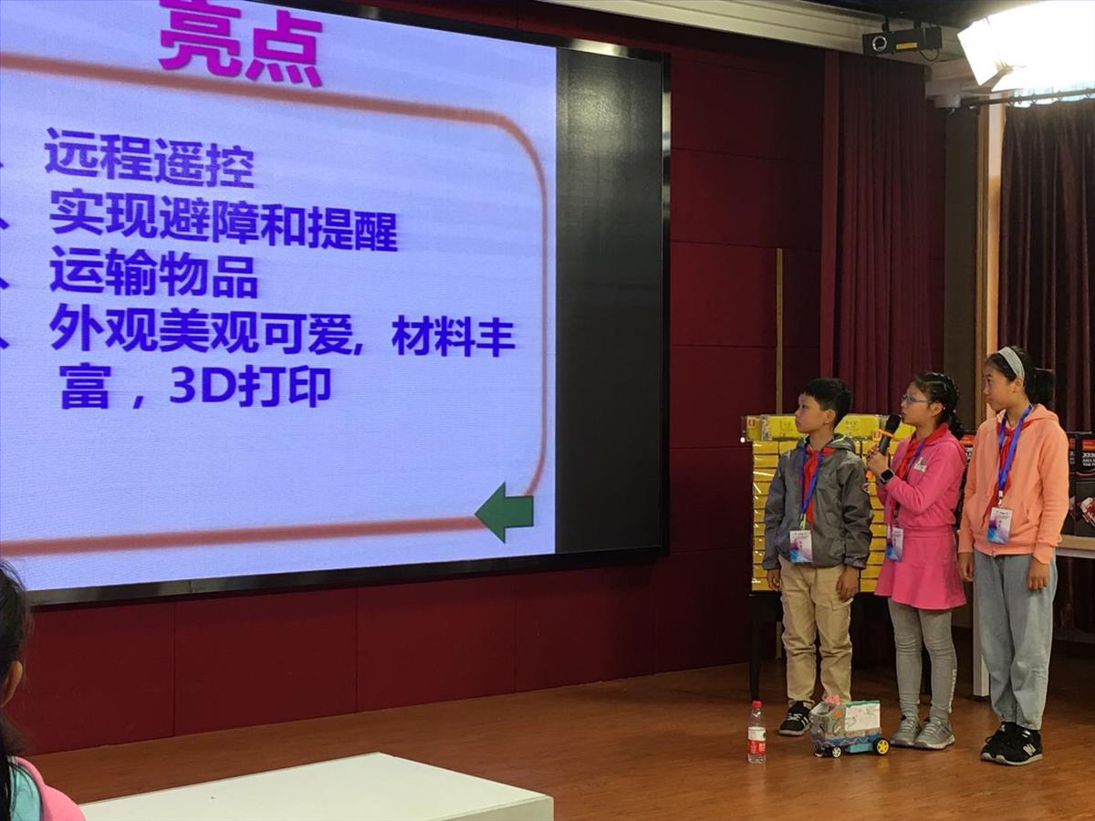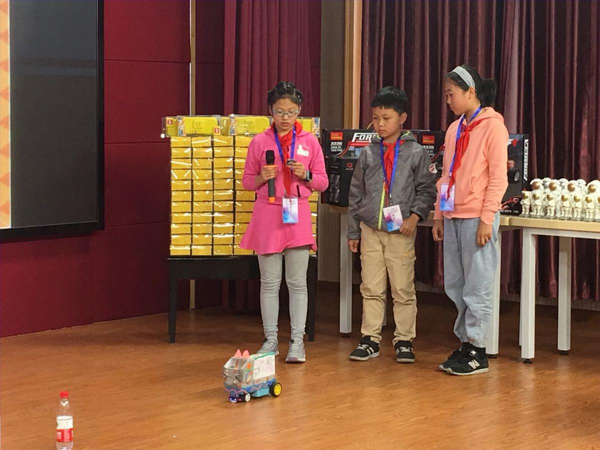 今天的比赛现场气氛异常活跃,其他学校的作品也都有一定的创造力:有的作品是智能牙刷架,有的作品是智能车,有的是扫地机器人……而学校本次参赛的作品是可远程遥控的运输车。作品凭借可爱的外观、强大的功能、沉着自信的展示演讲与现场演示,最终获得了团体奖一等奖的好成绩。团队队长庄欣蕾同学同时还获得了优秀程序员奖的荣誉称号。