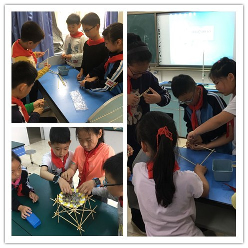 4月24日开展的是团体项目——“木支架承重”的决赛。比赛当天,选手们信心百倍地投身于比赛中:第1组的选手分工明确,有的负责捏木棒,有的负责绑橡筋,忙得不亦乐乎;第3组的选手们也不甘落后,3个人负责完成支架的主体部分,其余2个人负责附件部分地搭建……随着时间的推移,13分钟后第2组的队员们首先完成了支架地搭建。接着激动人心的时候到了——挂砝码了。在老师的一声令下,竞争正式开始,“慢一点,轻一点挂。”“要挂得对称,不然重量会偏的。”……选手们的话语伴随着整个紧张的比赛。经过十多分钟的激烈竞争,最终决出了年级组的冠军。
